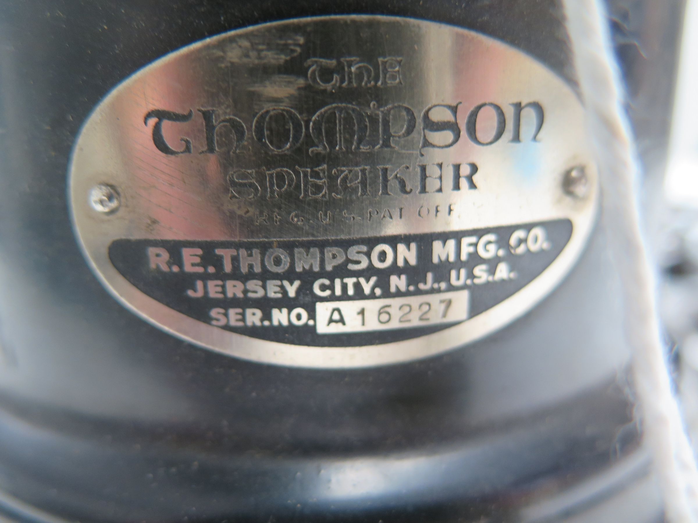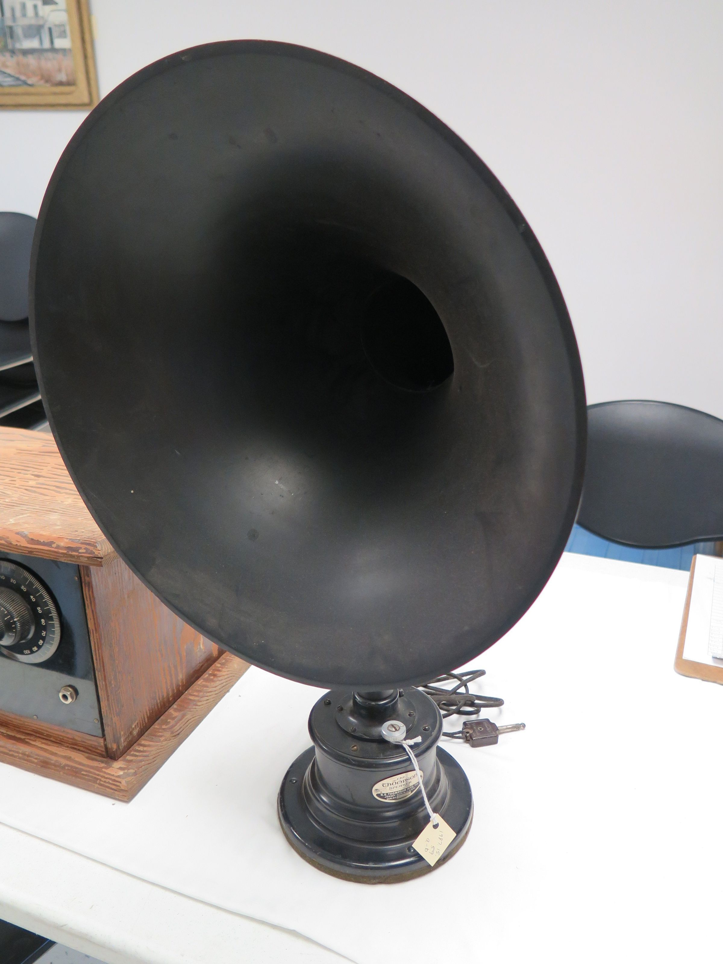 This is a large horn type speaker (b) for a Crystal radio and its base (a). The serial number on the speaker is A16227. This speaker was produced by Thompson Mfg. The speaker measures 23" (h) x 15" (w) x 13" (d).