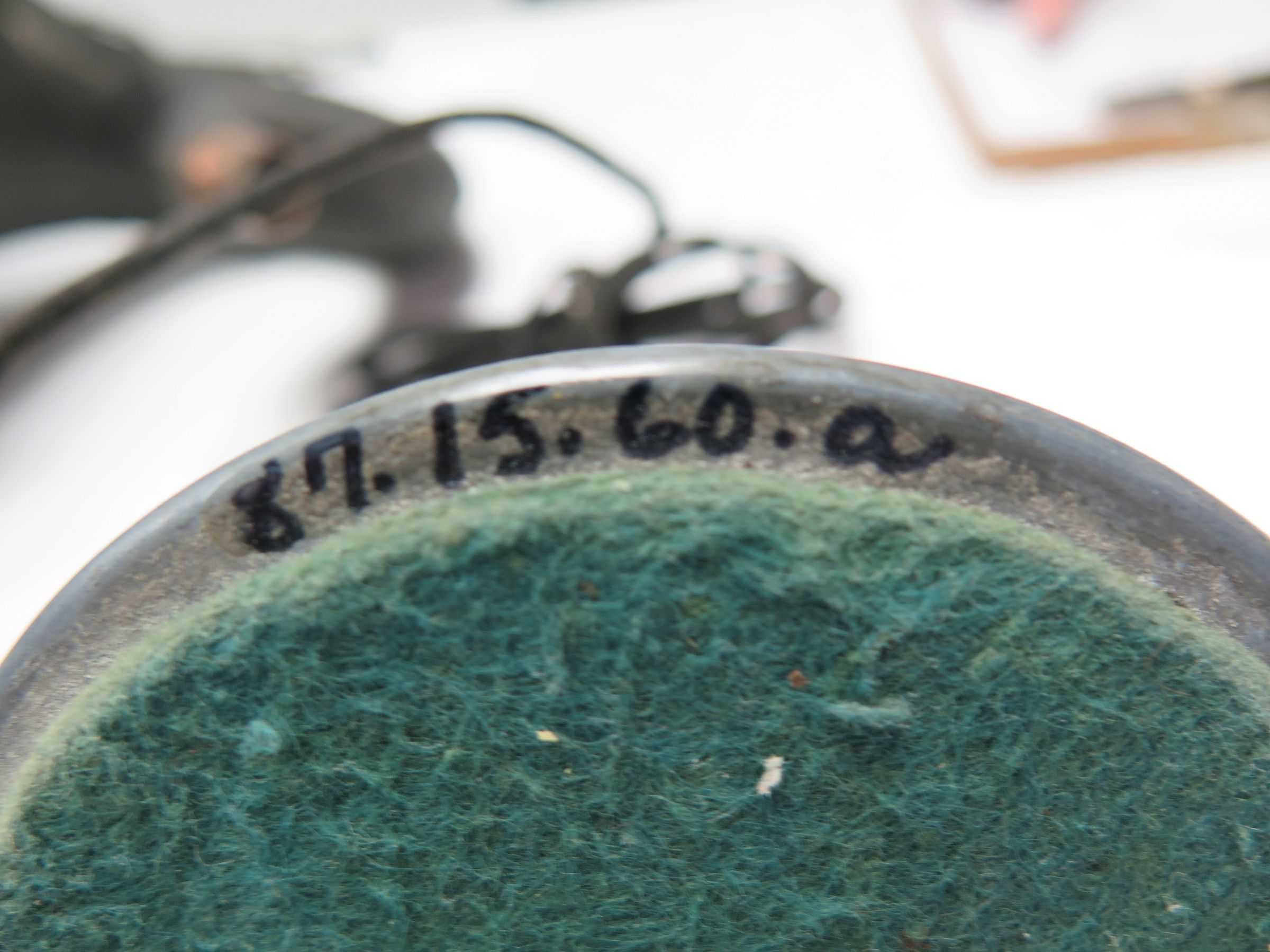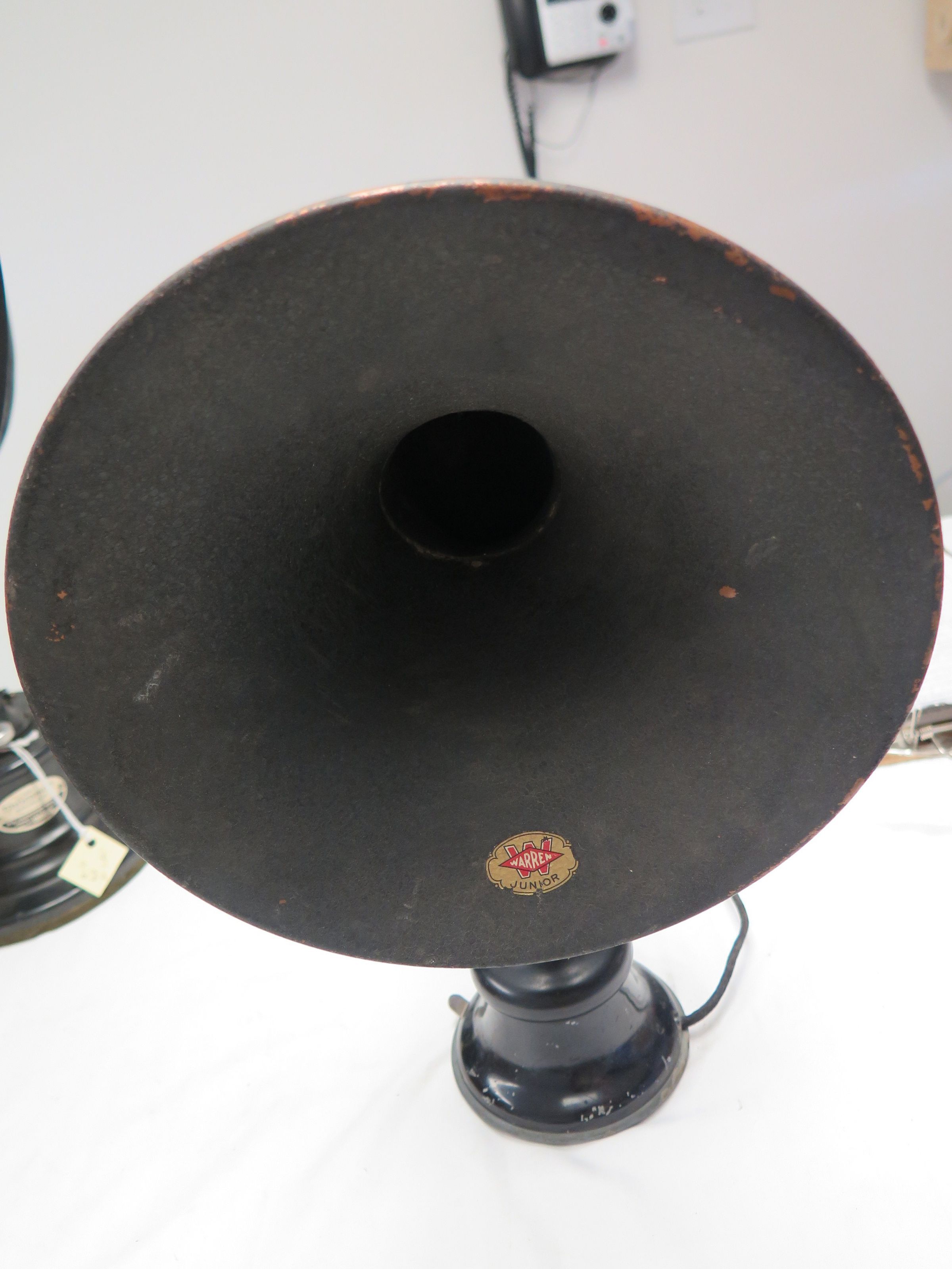 This is a small horn type speaker (b) for crystal radio and its base (a). There is a sticker on the speaker that reads, "Warren/ Junior". The bottom of the speaker base is covered in green felt. The speaker measures 15" (h) x 9" (w) x 8" (d).Collection