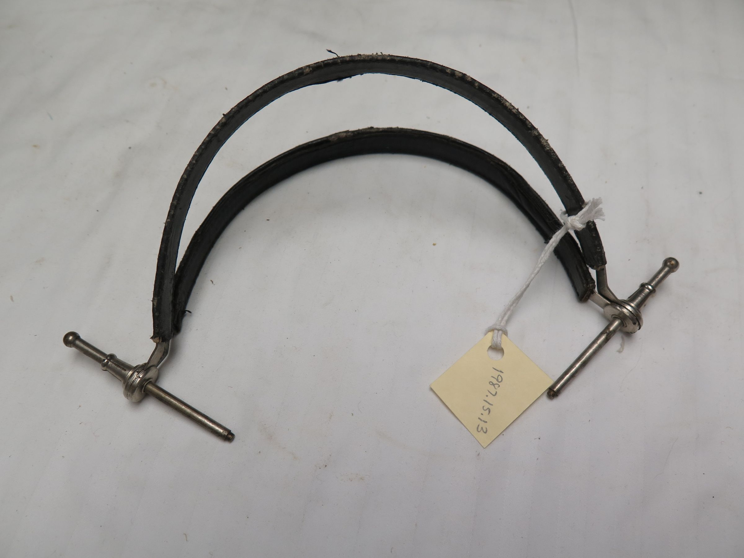 This is a metal headphone holder with no ear pieces. The part of the holder that goes over the head is covered in leather. The holder measures 5" (h) x 9" (w) x 3" (d).