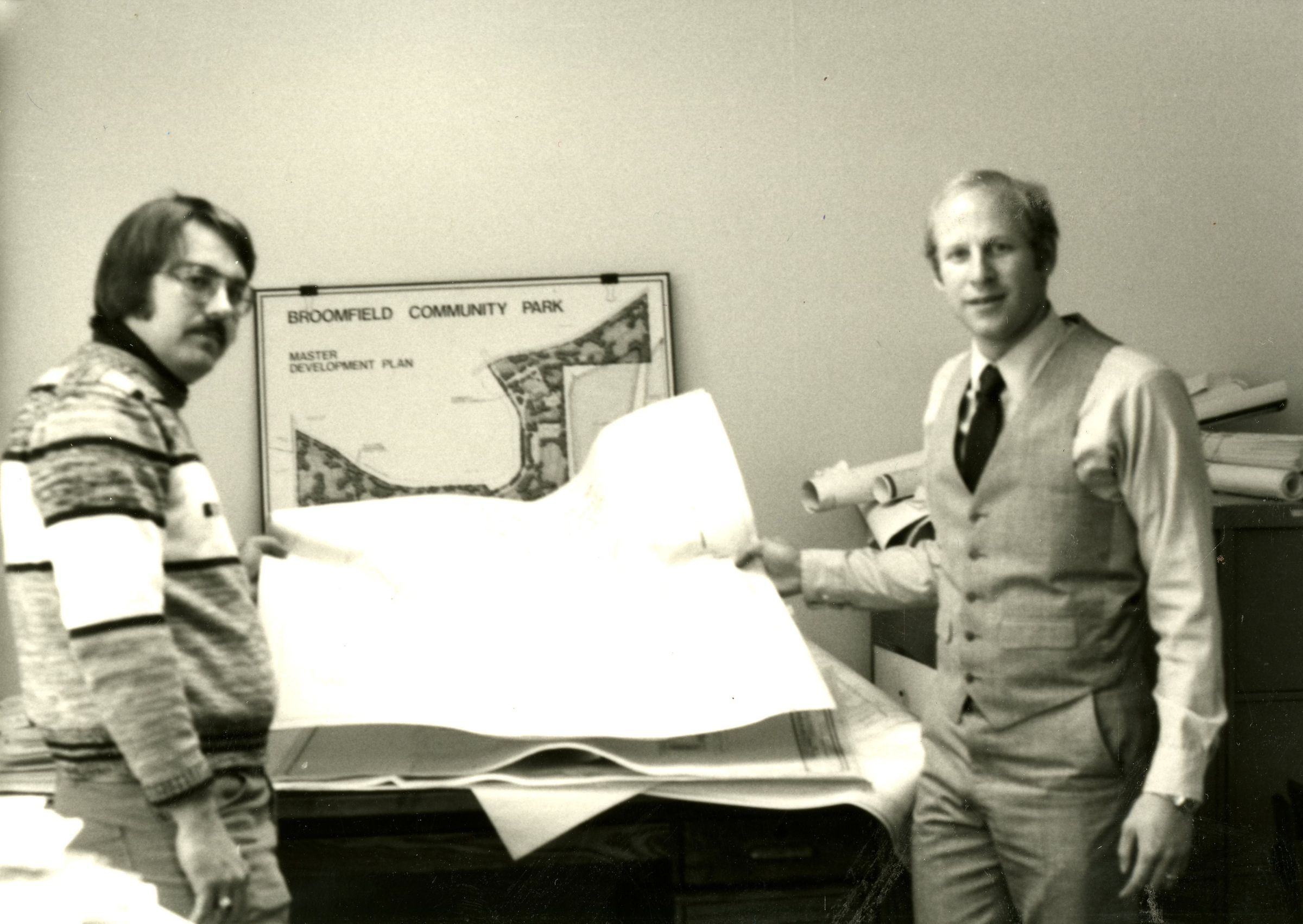 Dan (?) Wigert (R) in office with Dave Shelly. Broomfield Community Park map in background. B&W photo.Collection