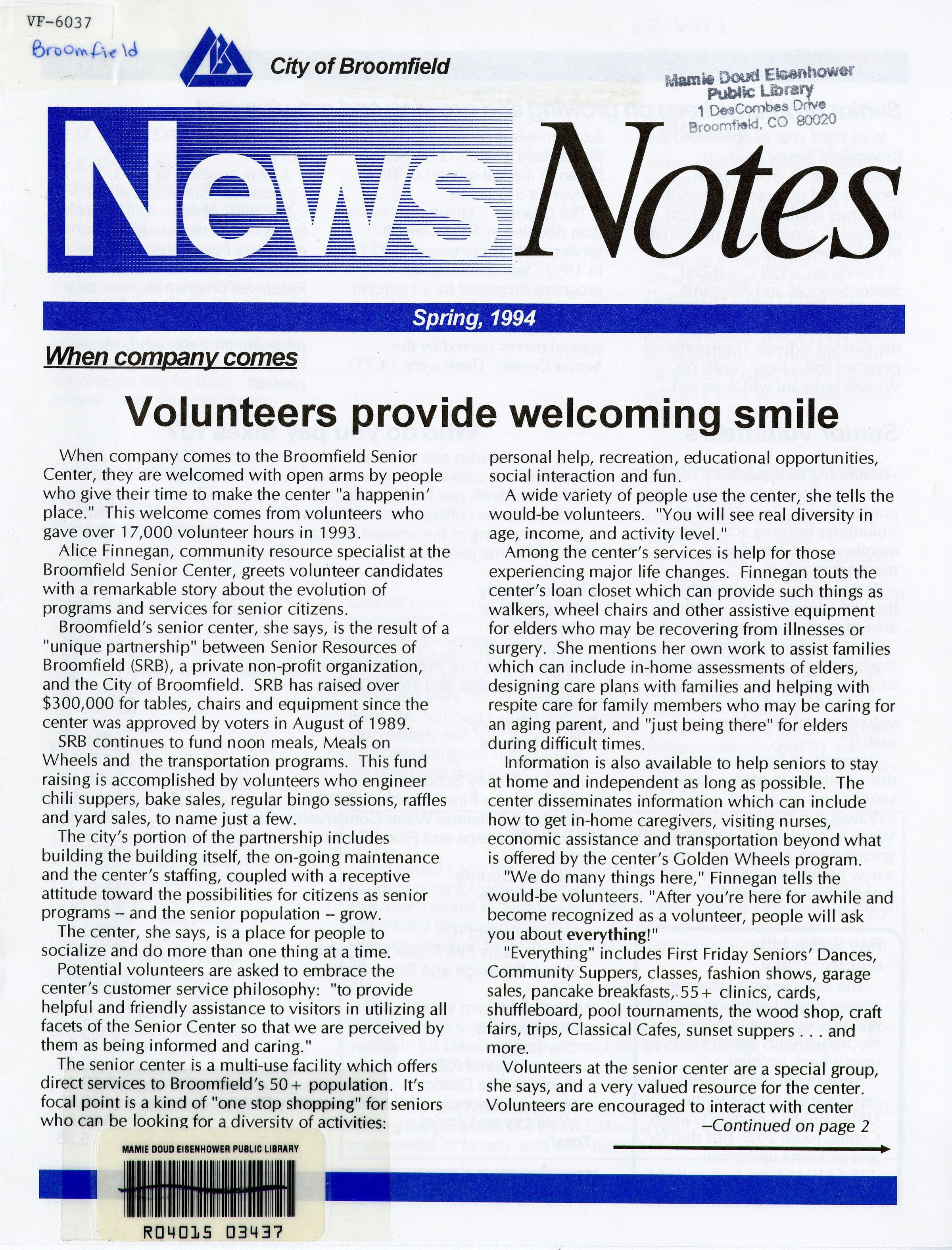 Newsletter sent out by the City of Broomfield in spring of 1994. Includes sections on welcoming volunteers, participation in National Library week, ornament sales funding library sculpture, Safeco Insurance donating portable breath testers to police, community safety, snow reminder removal, and construction on Midway Blvd.Lexicon