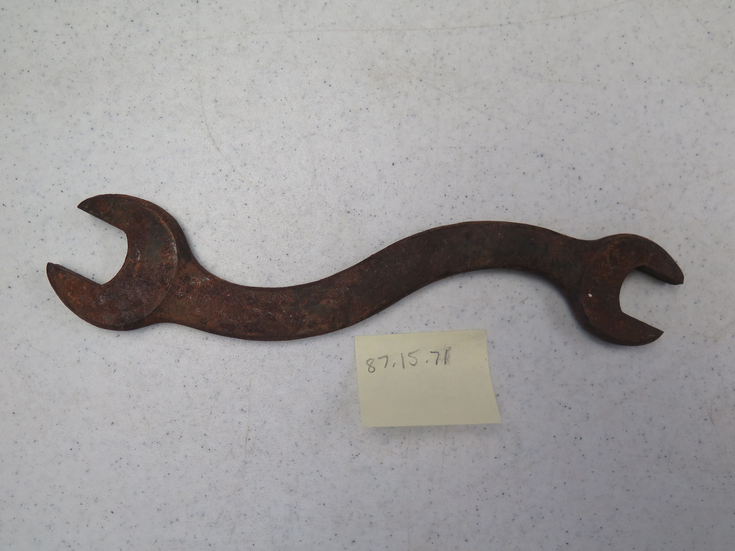 This is a rusty metal open end wrench. The wrench is curved on both sides. The wrench measures 0.25" (h) x 2.5" (w) x 9.5" (l).Collection