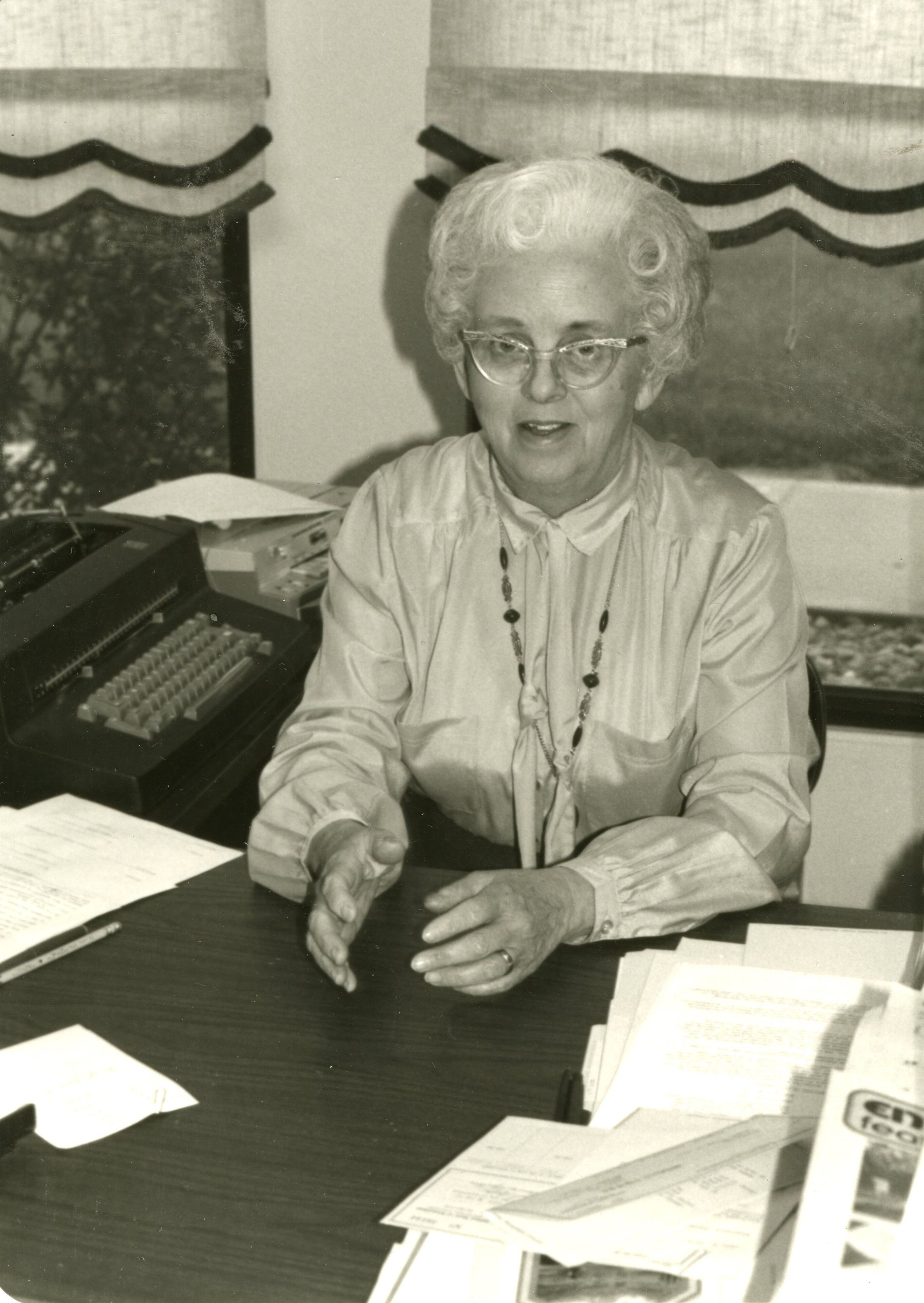 Black and White photo of Lucy Brown - Secretary with permed hair, cat-eyed glasses and long sleeve blouse. Next to her is some papers and a typewriter.Collection