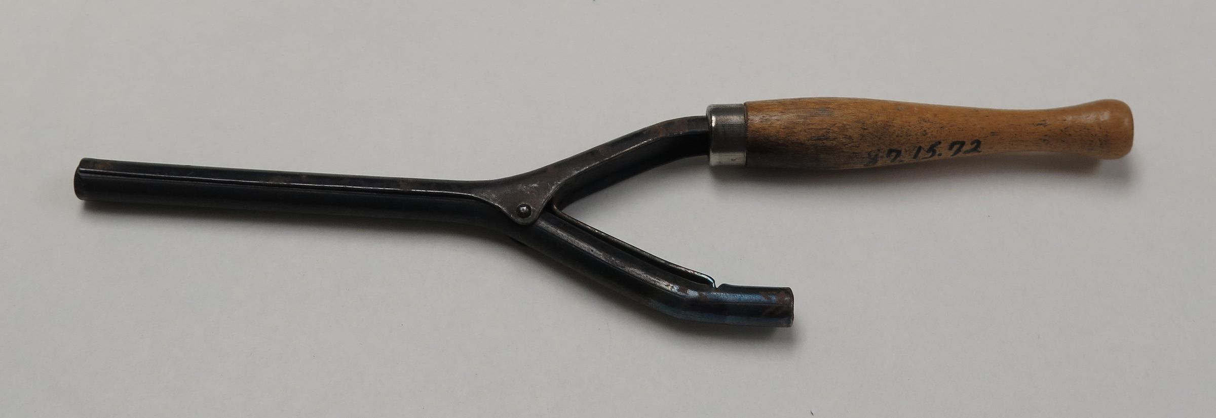 This metal and wood curling iron measures 2"(W) x 9.5"(L). This curling iron is missing on of the wooden handles.