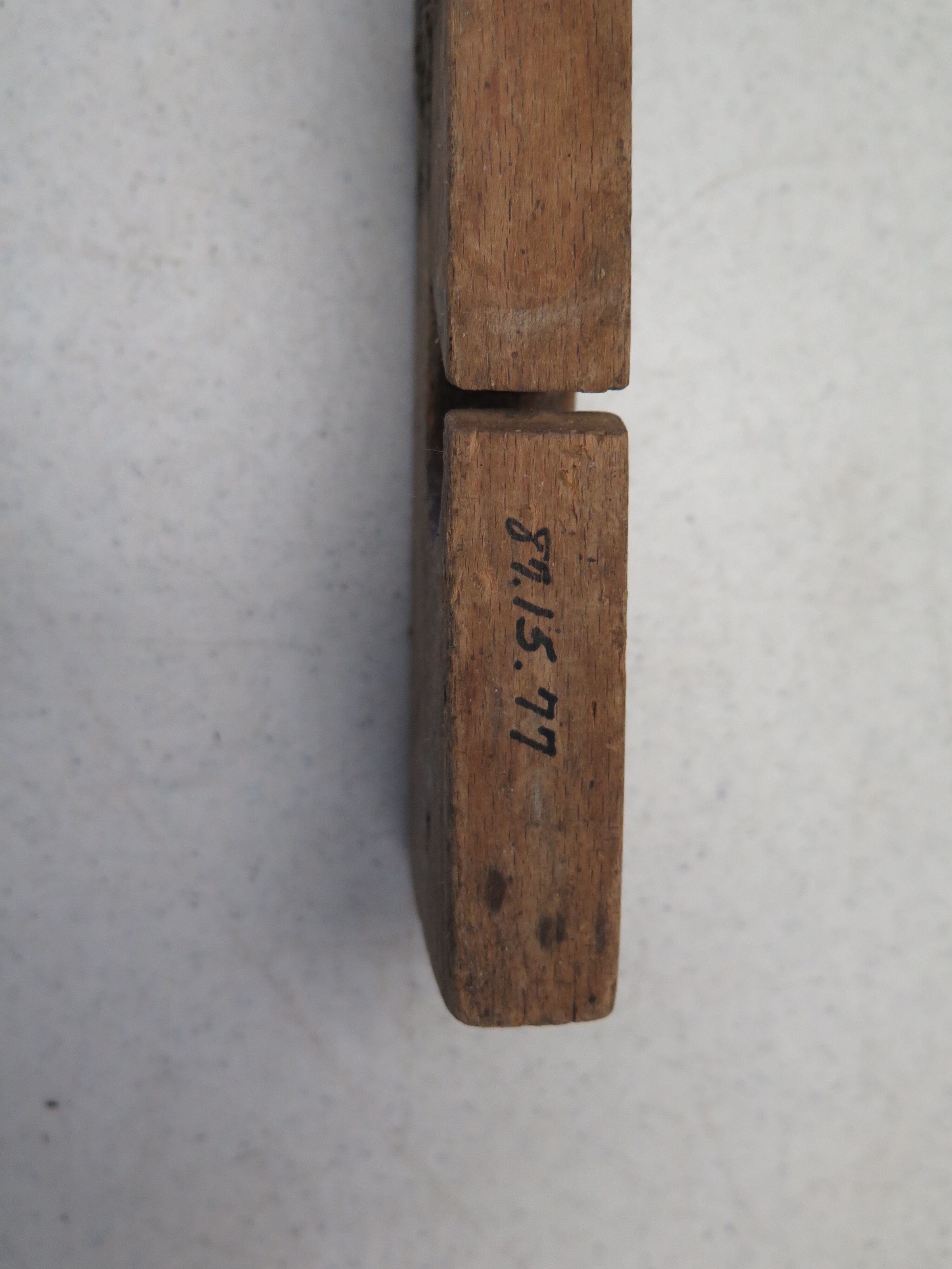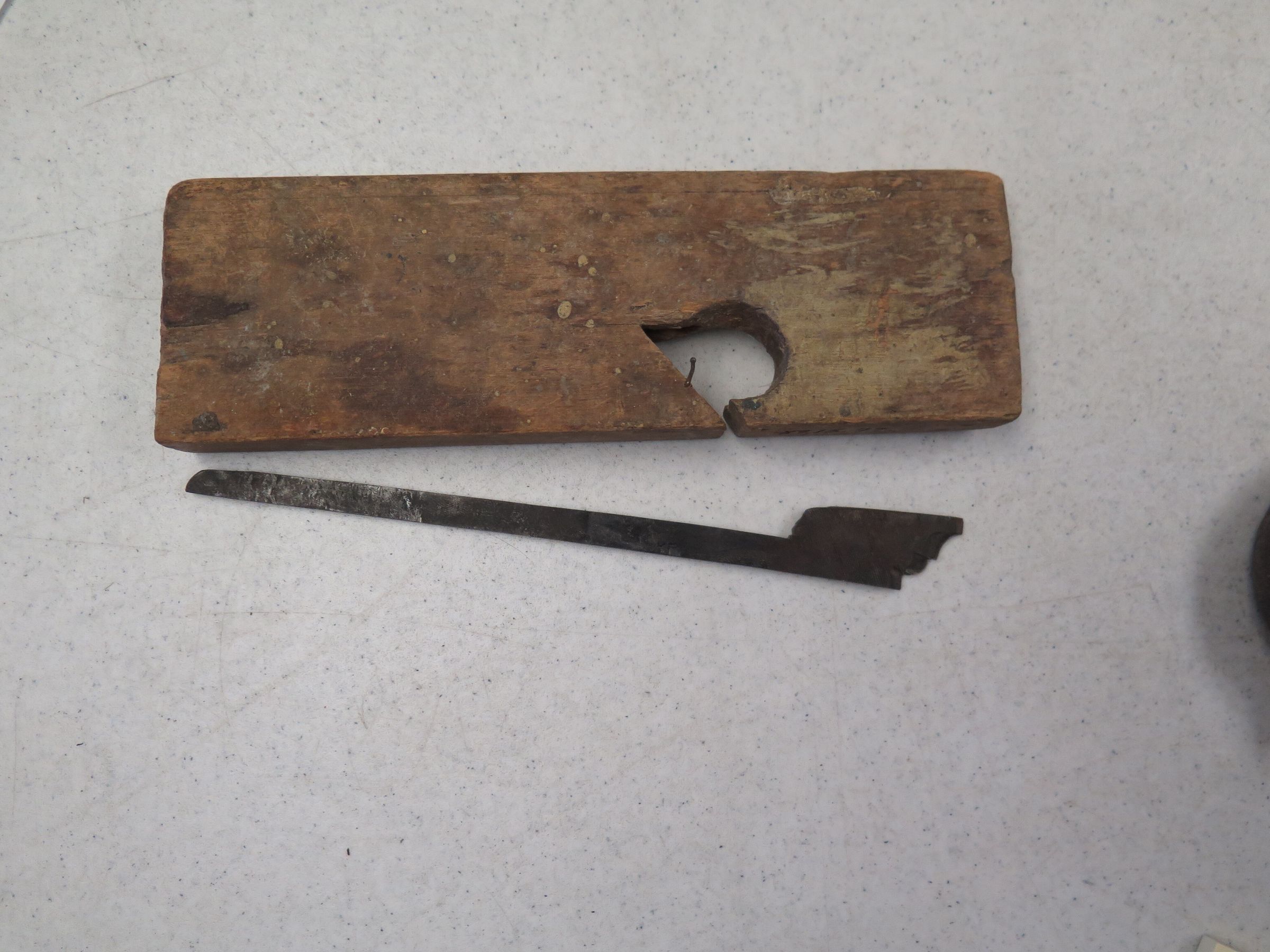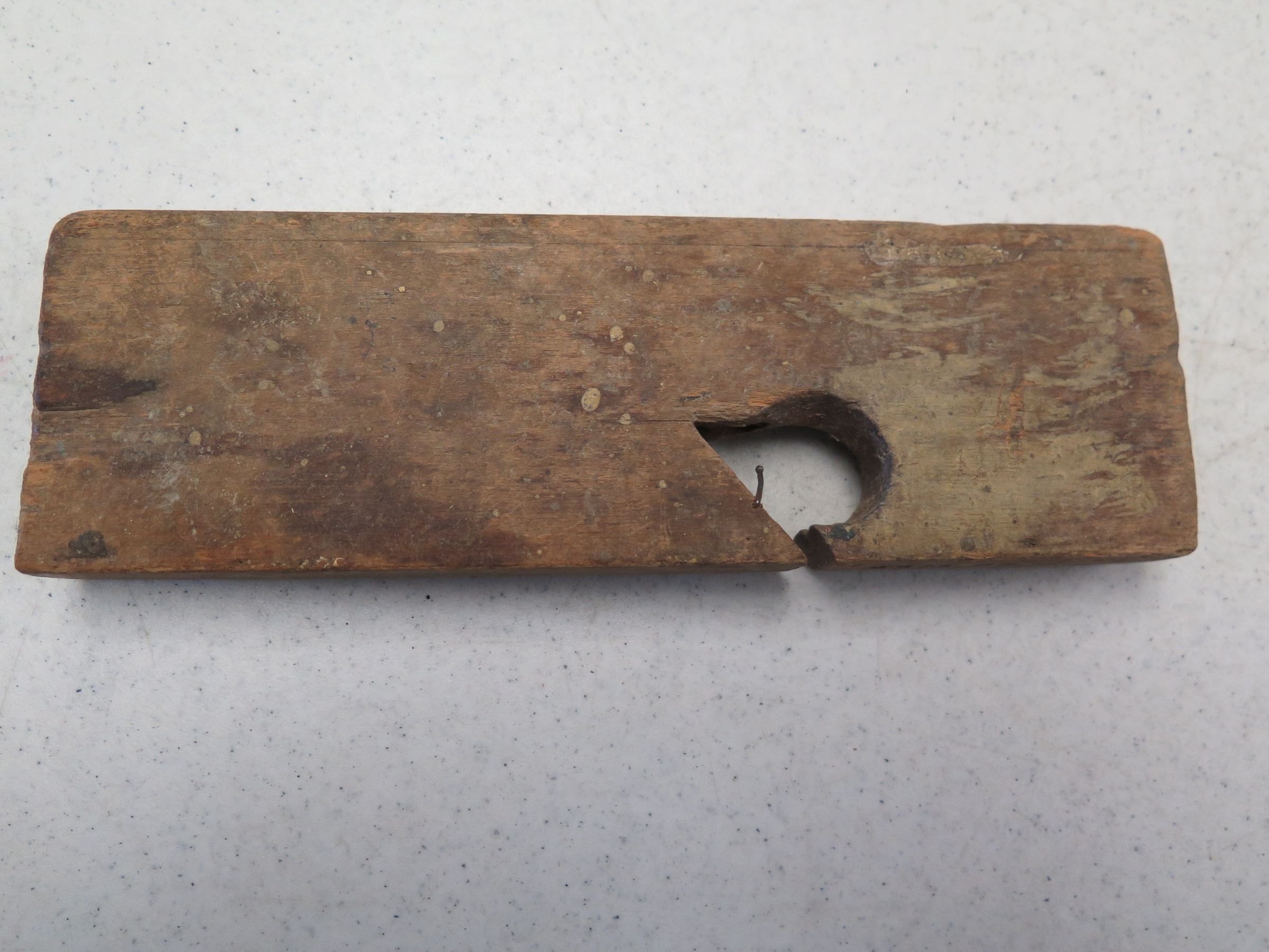 This is a wood plane. The plane has come apart into 2 blocks and a blade. The block measures 1" (h) x 3" (w) x 9.75" (l).Collection