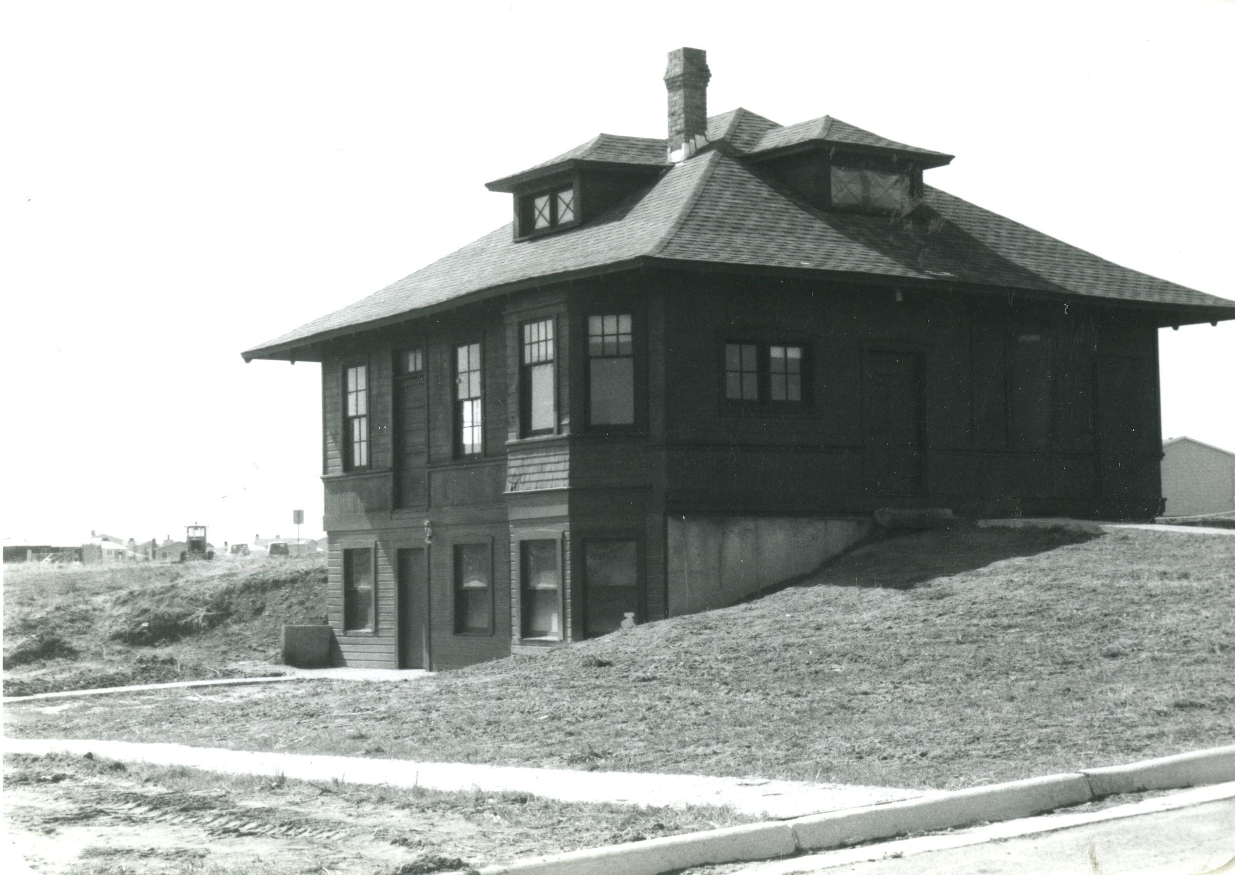 Black and White photo of the Broomfield Train depot in Zang Spur Park looking West. This is after restoration of the outside of the building. Now Broomfield Depot Museum.Collection