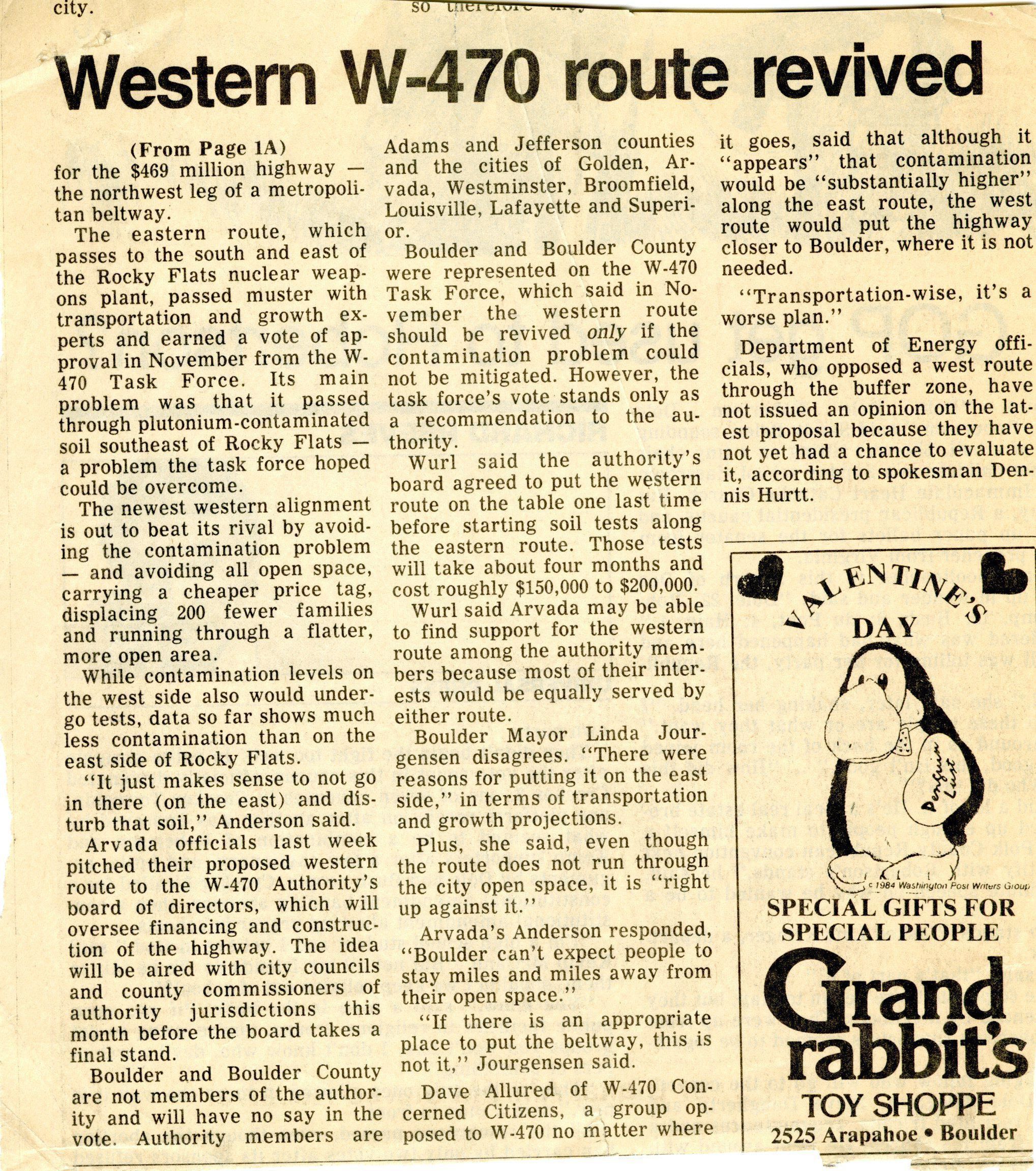 Newspaper clipping about possible routes for highway W-470. Choices would need to be made between Boulder open space and the Rocky Flats' buffer zone.
