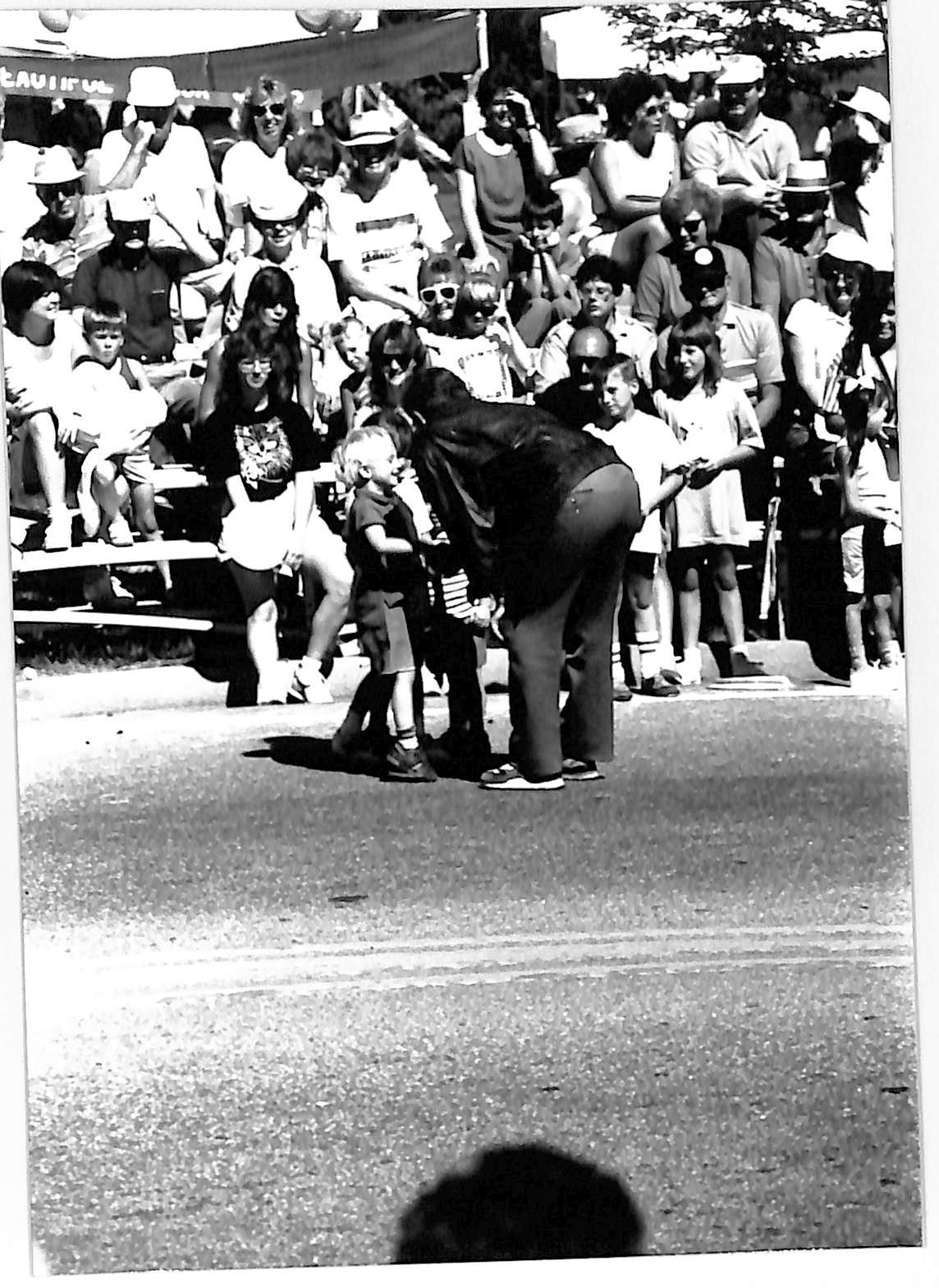 Item is a black-and-white photograph taken during the 1989 Broomfield Days event. In the photo, a parade is occurring in the street, and crowds have gathered on some bleachers to view the celebration. In the road, a man wearing a leather jacket is leaning over to talk to some little kids. Behind the crowds are white tents hosting other festivities.Photograph Details