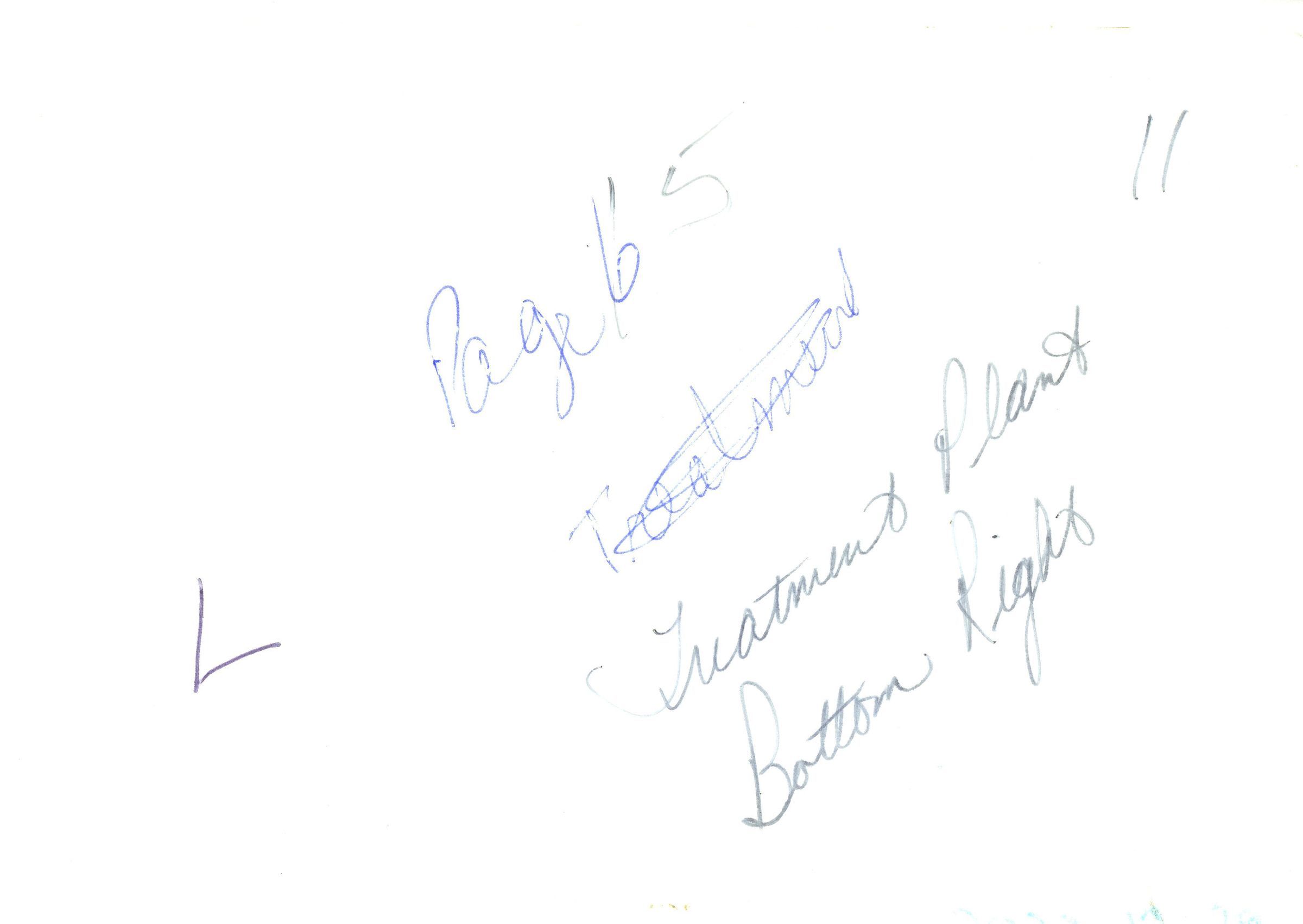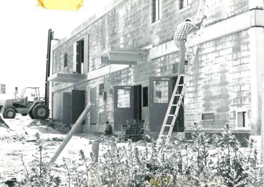 Wastewater treatment plant in construction. Man wearing hard hat climbing ladder in front of a two story building identified as being at the original wastewater treatment plant near W. 112th, forklift in background.Photograph Details