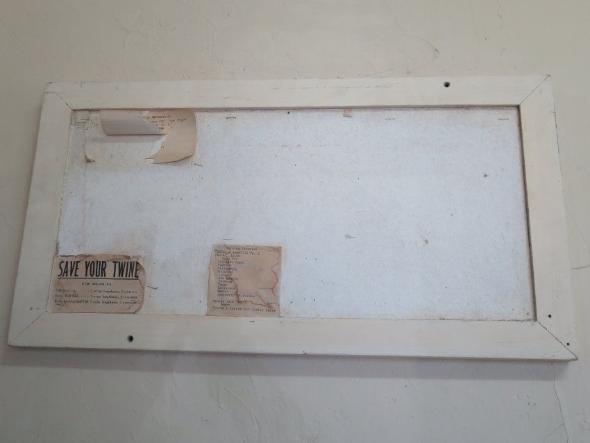 This is a bulletin board with a wood frame that is painted white. It was probably used in the old post office. There are 3 notes stapled to the board. One note starts with the text, "Save Your Twine" and is about tying up boxes. One note is about Morning Dispatch. The last is about Pouches Due to be Received. The bulletin board measures 14.5" (h) x 27.5" (w) x 1" (d).Collection