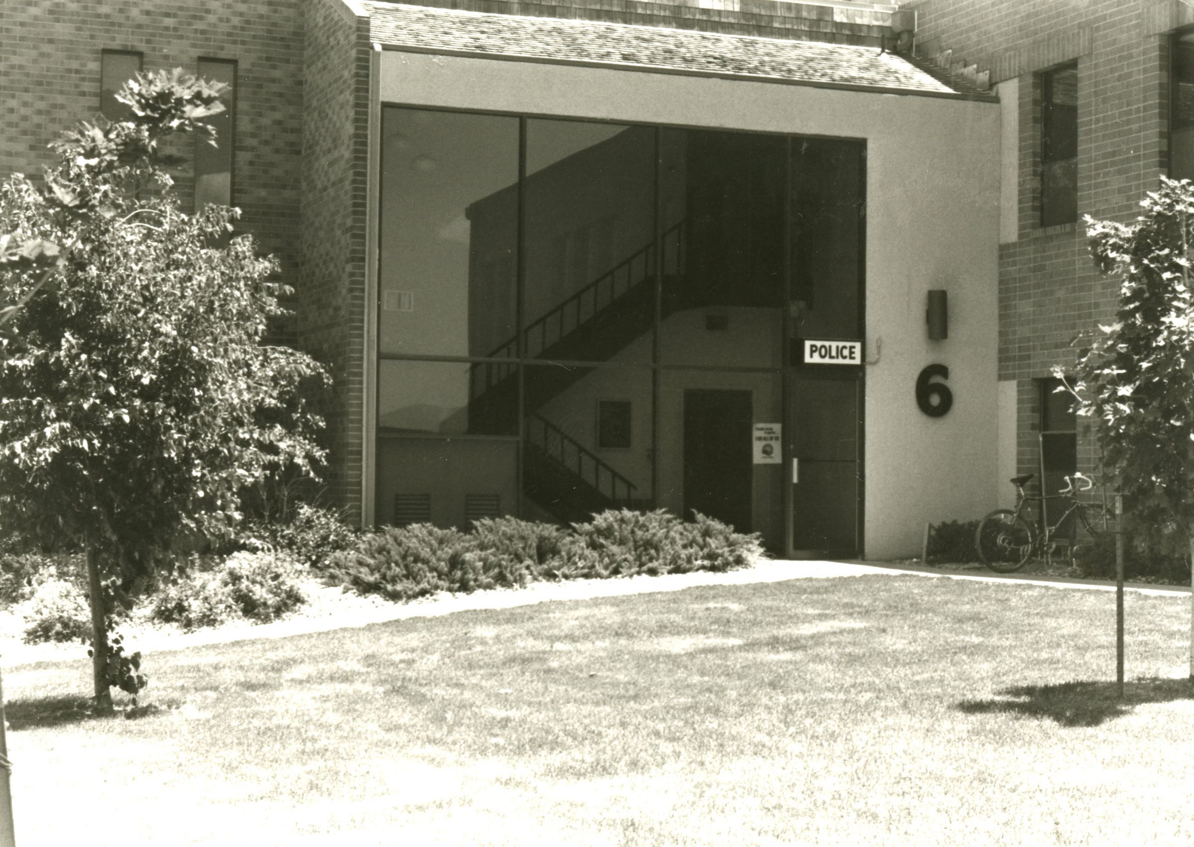 Front of 6 Garden Center. Sign over door maked POLICE. Two small trees in front.