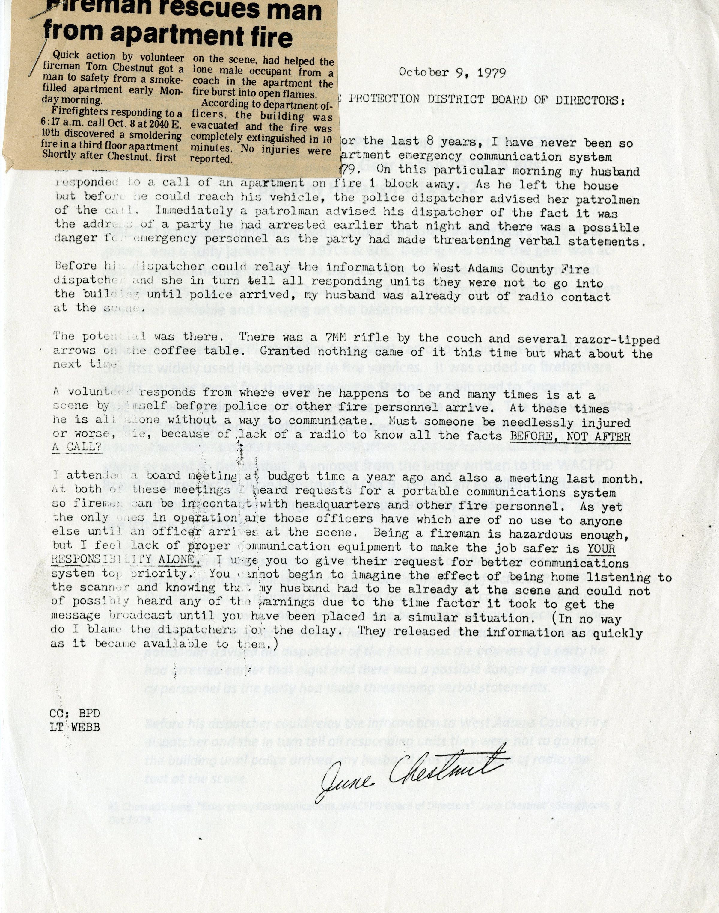 A letter regarding an incident on the morning of October 8, 1979 (written on October 9, 1979). It addresses a potential hazard regarding communication. June Chestnut, the person who wrote the letter, writes concerning the lack of radio communication when her husband (a volunteer firefighter) entered a potentially and needlessly dangerous situation when it could have been communicated that entering was dangerous via radio. On the front, there is a news clipping that reads " Fireman rescues man from apartment fire."Collection