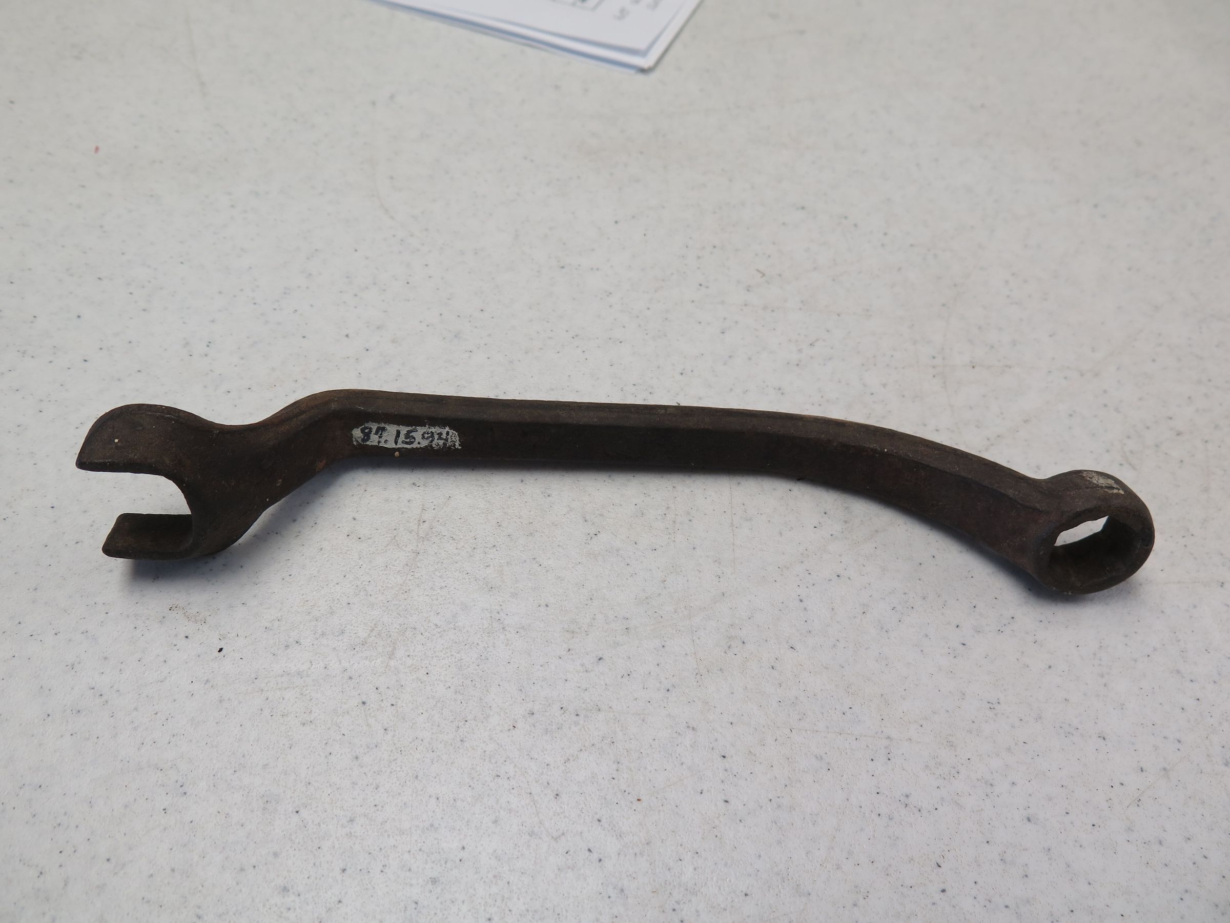 This is a curved wrench open with a box end. The wrench measures 1.5" (h) x 1.75" (w) x 9" (l).Collection