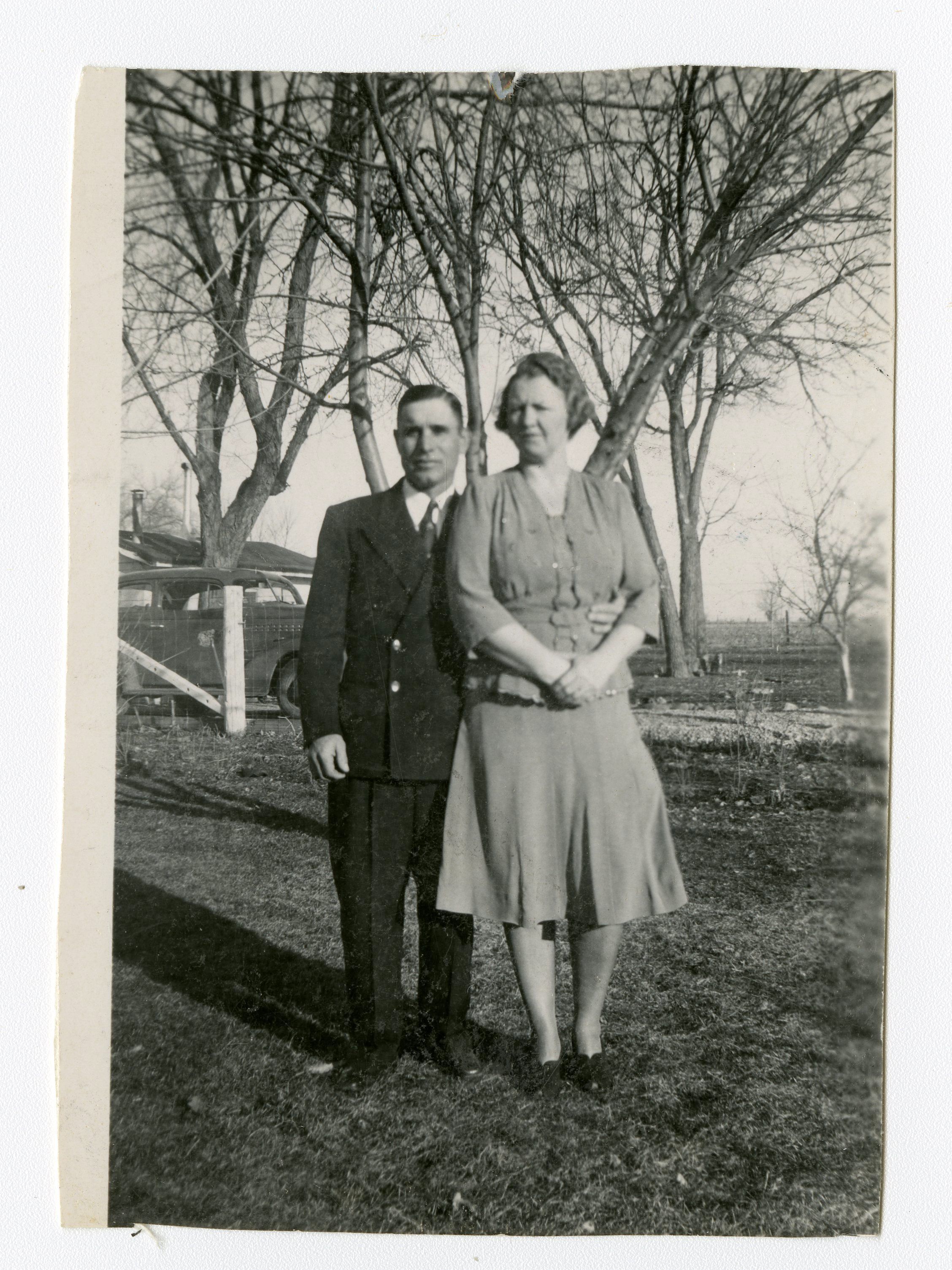 Black and white photograph of a man and a woman. The middle ground has a fence and car while there is a house in the background, on the left. The man is wearing a dark suit and a white collared shirt. The woman is wearing a matching blouse and skirt. Photograph was taken outside in front of the Brunner Farm. Subjects are probably Lester C and Lib Brunner.