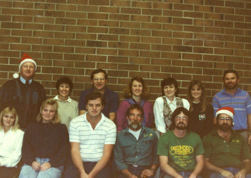 Color photo of 13 persons, 7 male, 6 female in front of brick wall. Two men wearing Christmas hats.One man wearing a green Broomfield Pride t-shirt. Paul Derda is in the santa hat. Location possibly at the old recreation center.