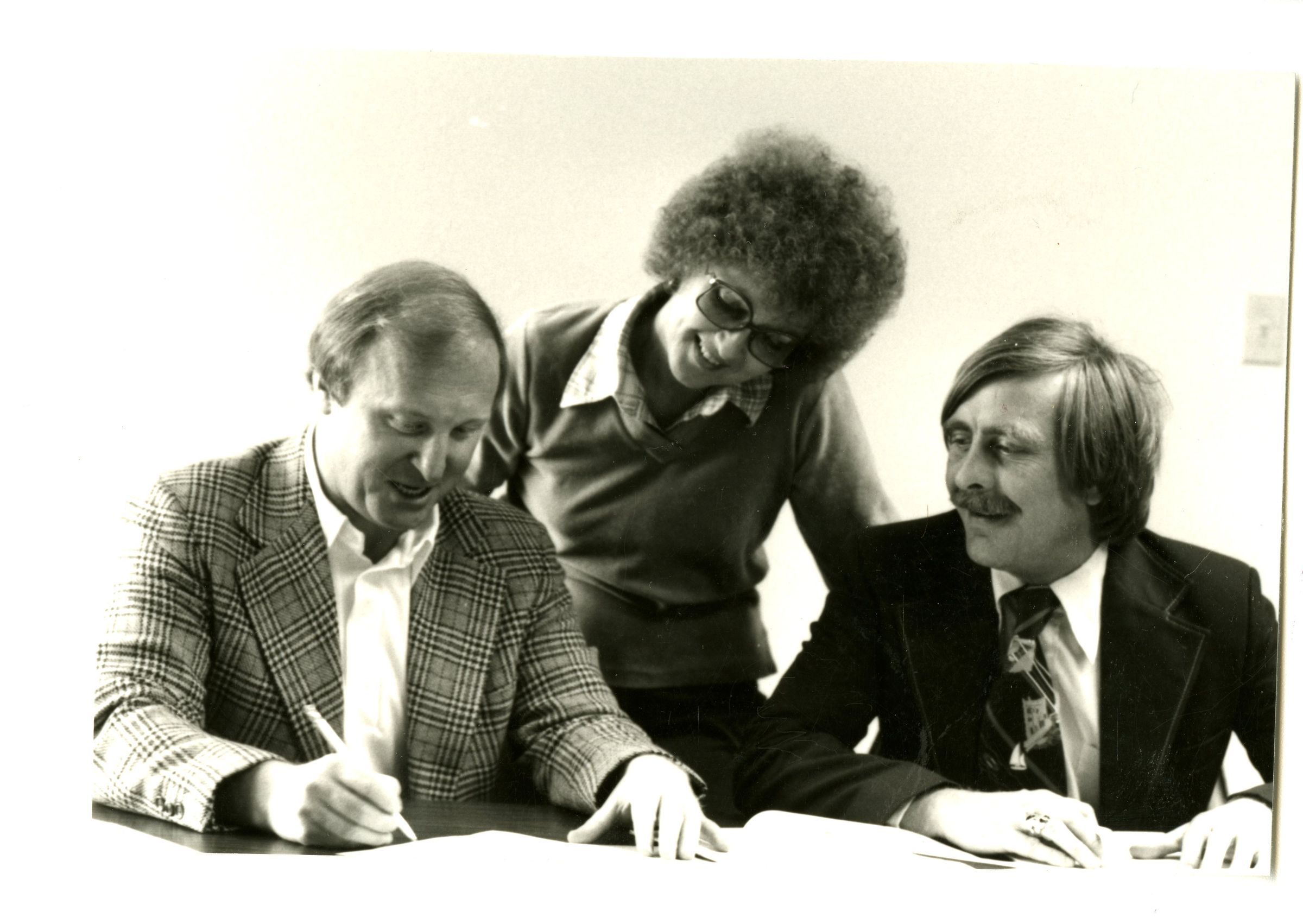 Two men sitting at a desk (Paul Derda and Jay Threat) and one woman (Pat Caldwell) standing behind them. One man is writing, the woman is wearing glasses and the second man is wearing a dark suit and tie and has a mustache.Collection