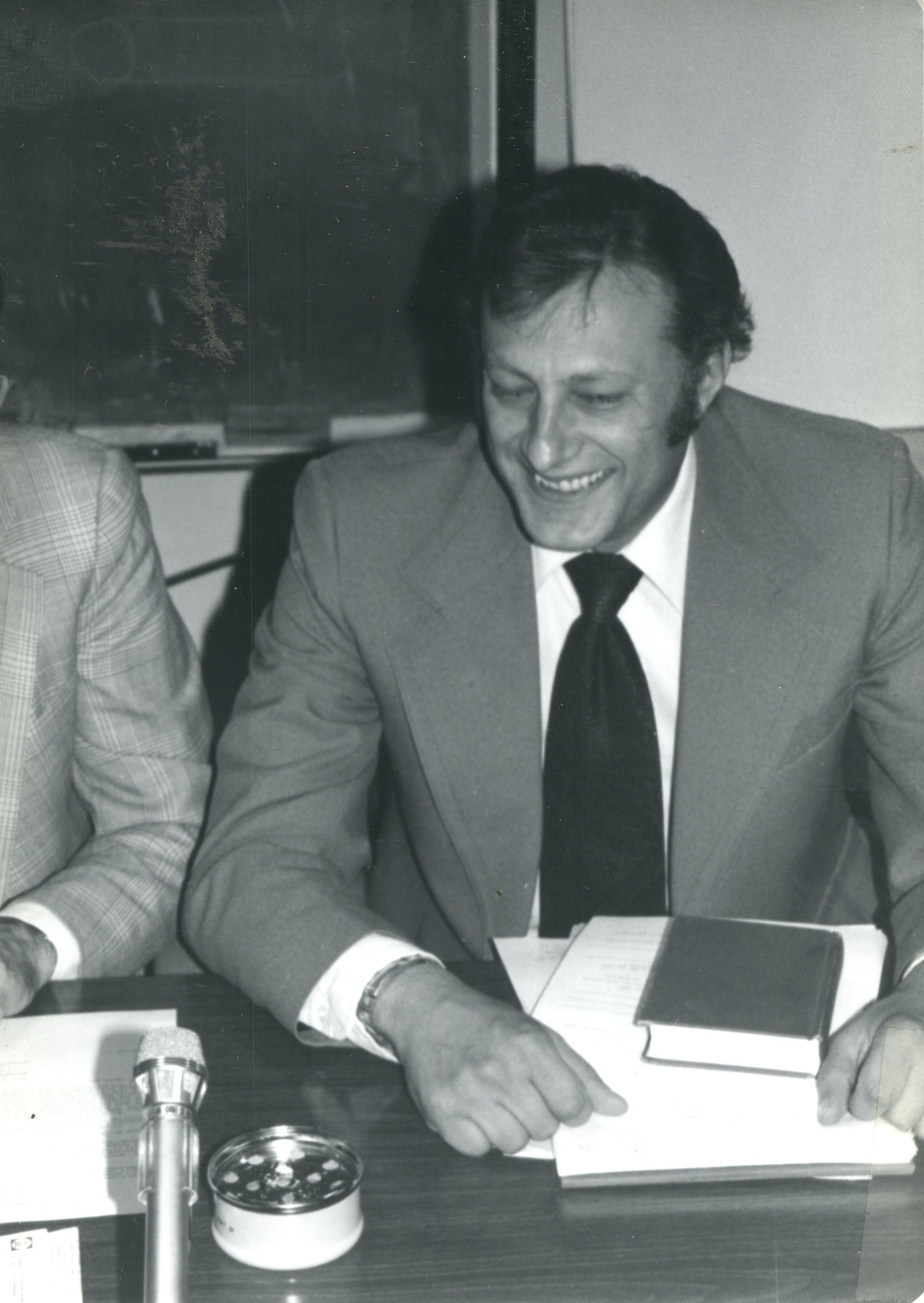 Man identified as George DiCiero in suit and tie sitting at desk. Papers and a book on the desk in front of him. Micrphone on the desk.