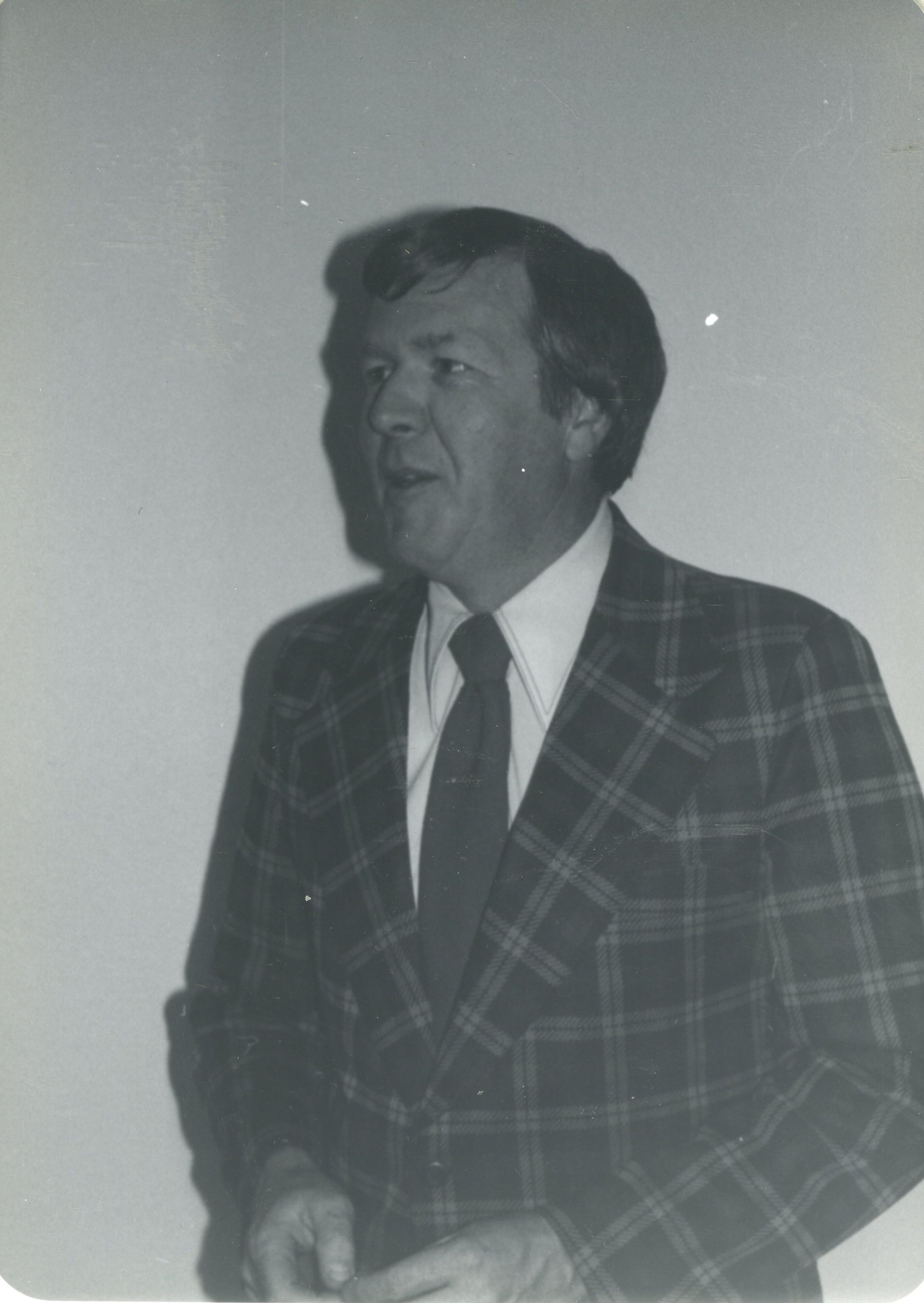 Man identified as Walter Spader standing in front of a wall wearing a striped suit and dark tie.
