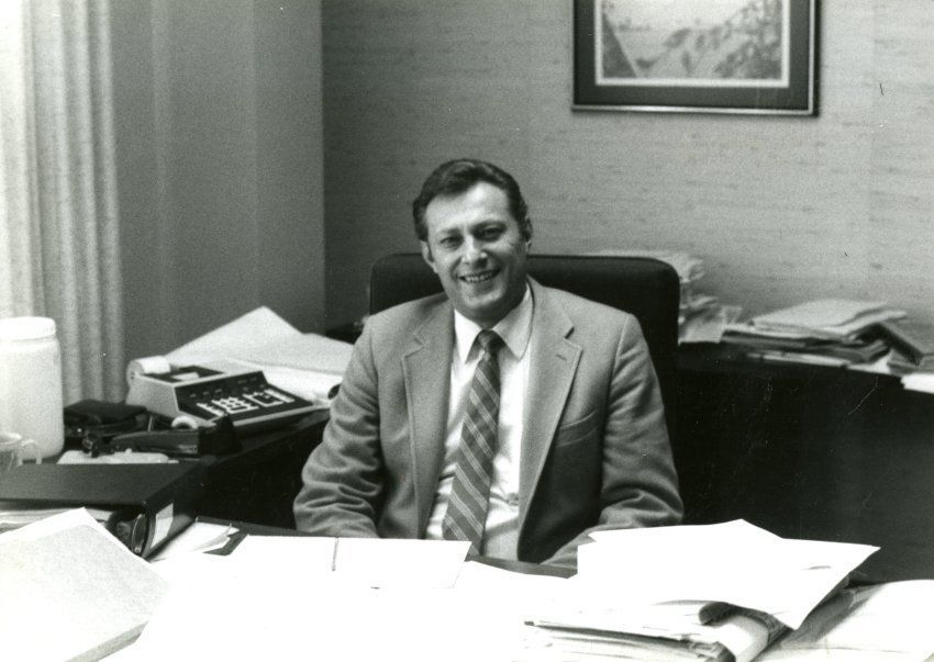 Man identified as George DiCiero in light color suit and striped tie, smiling sitting at a desk. Papers and binders on the desk, adding machine behind and to his right side. Picture on the wall behind him.Collection