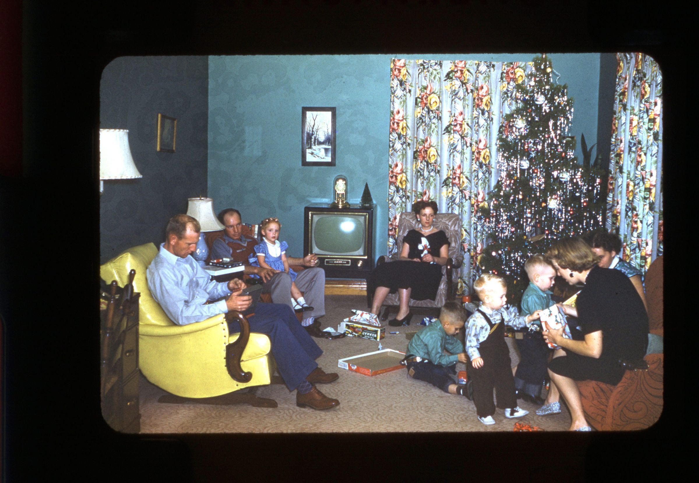 Color film slide showing several people in a living room. There is a Christmas tree on the right side of the image. From eft to right the people are Dale Brunner, Gib Brunner, Gilda Brunner, Ila Brunner, Marata Brunner, Charles Brunner, David Brunner, Dale Paul Brunner, and Carrie Brunner.Photograph Details