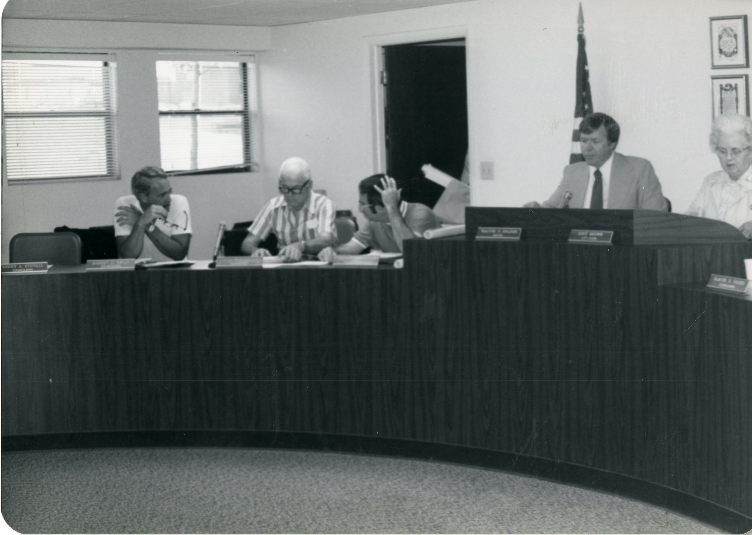 Possibly the broomfield City Council or BOD, sitting around a wide desk, 5 people are visible in the photo, however it is likely that more are present within the room. Two people, a middle aged man, and an elderly woman, are seated at a higher up podium. Their desks have name plates, however they are not easily readable in the photo. Behind them sits an american flagLexicon