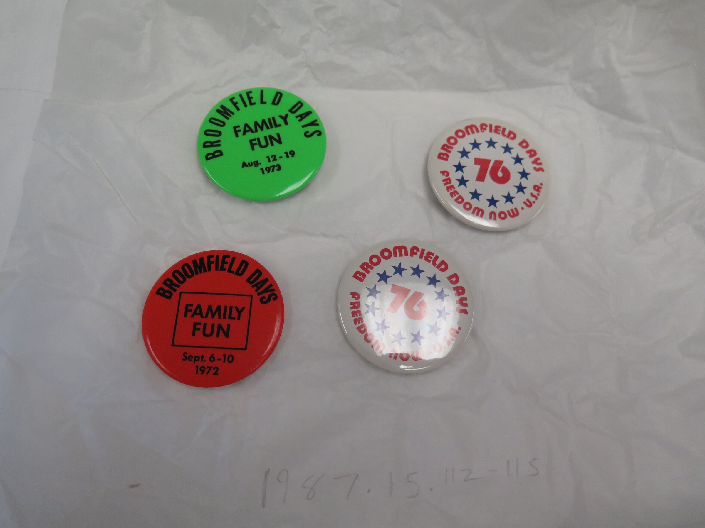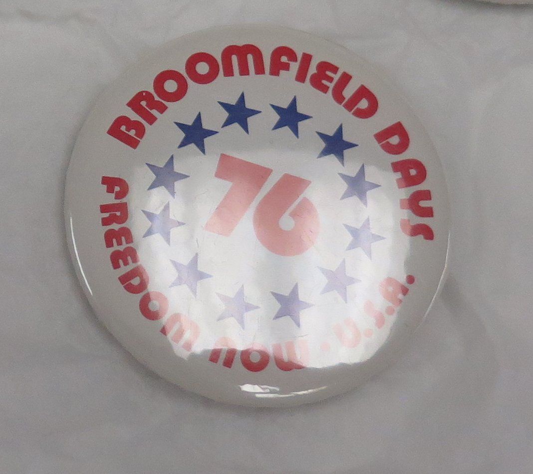 This is a round white Broomfield Days button from 1976. The front of the button has blue stars and red text that reads. "Broomfield Days/ Freedom Now U.S.A/ 76". The button measures 2.25" (dia).Collection