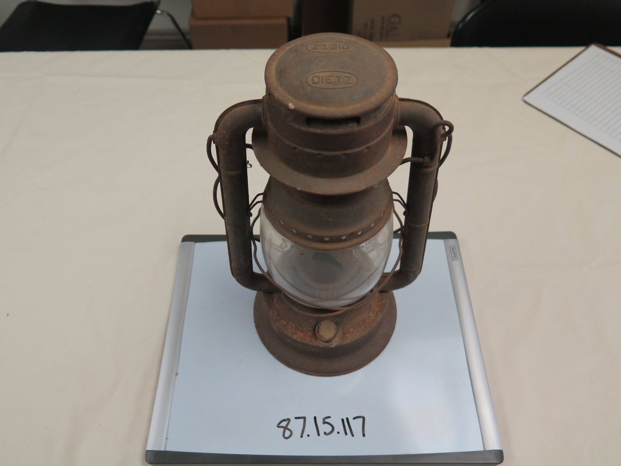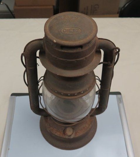 This is a Dietz farm lantern with a glass globe. The lantern measures 13" (h) x 7" (d) and is rusty.
