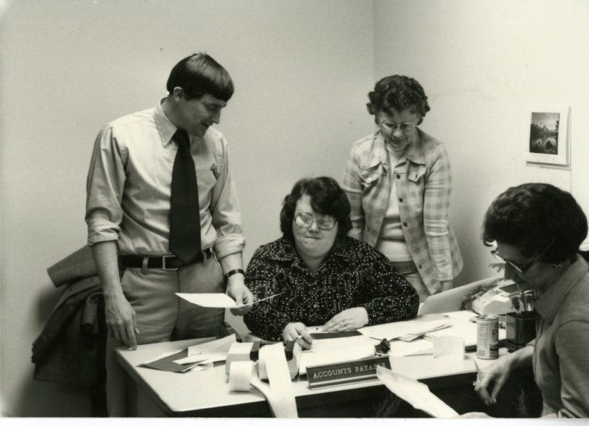 Four people standing around a desk marked "accounts payable", there are a lot of papers, and a printing calculator appears to have run all over in the bottom center of the photo. Photograph might include Terry Cole, Alice Hanson?, and Lorraine?Lexicon