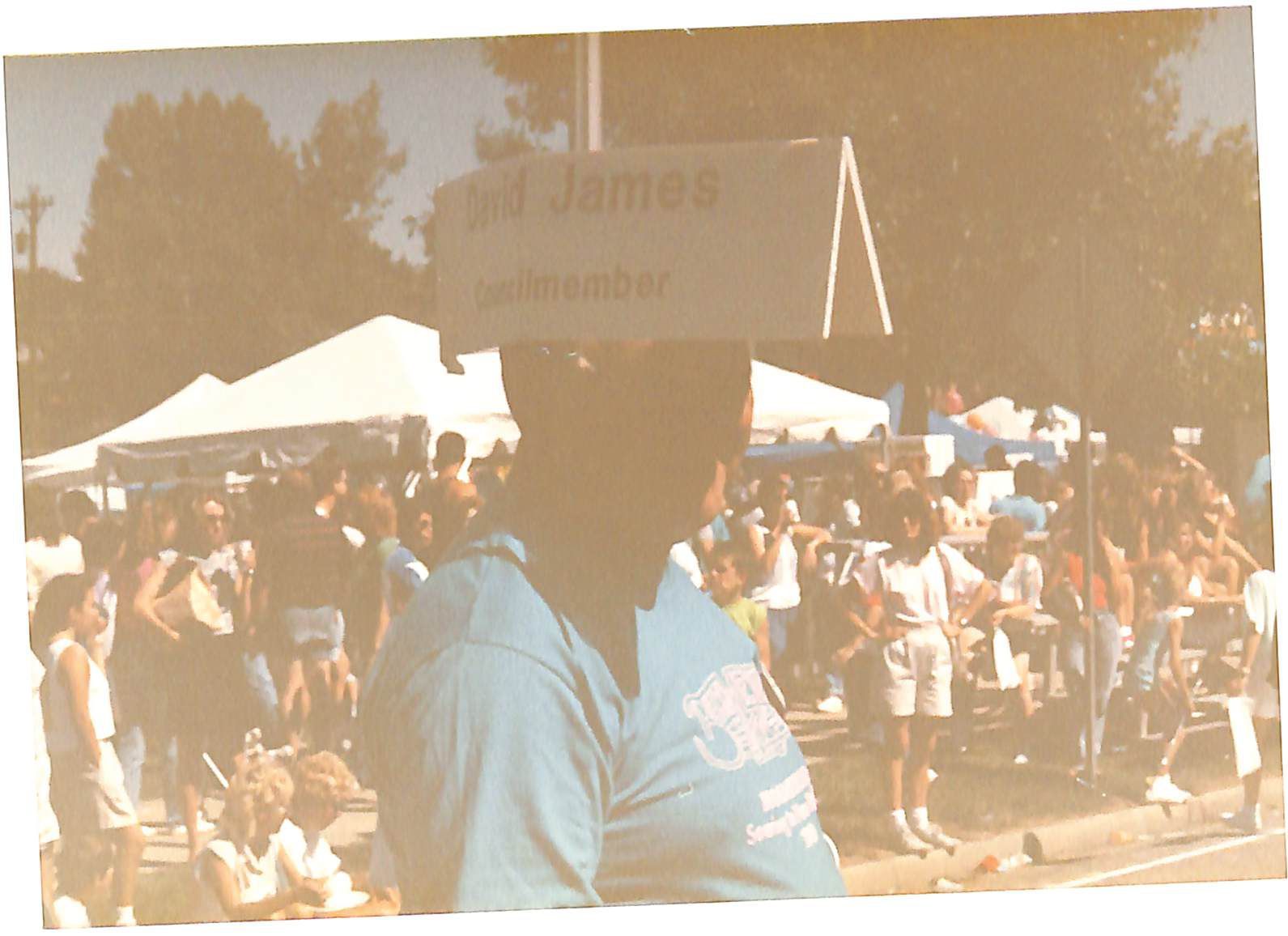 Item is a photograph printed on Kodak paper taken during the 1989 Broomfield Days celebration. The photo is foggy, but it is possible to make out a man in a teal shirt standing with a sign on his head that reads "David James, Councilmember." This man is most likely David James. From the angle of the photo, it is possible that he is standing in the street as part of the parade, which crowds have gathered along the side of the road to witness. White and blue tents, along with some tall trees, frame the background. David James was the Councilmember from Ward 2 elected on November 7, 1989, and his term expired in 1993.Photograph Details