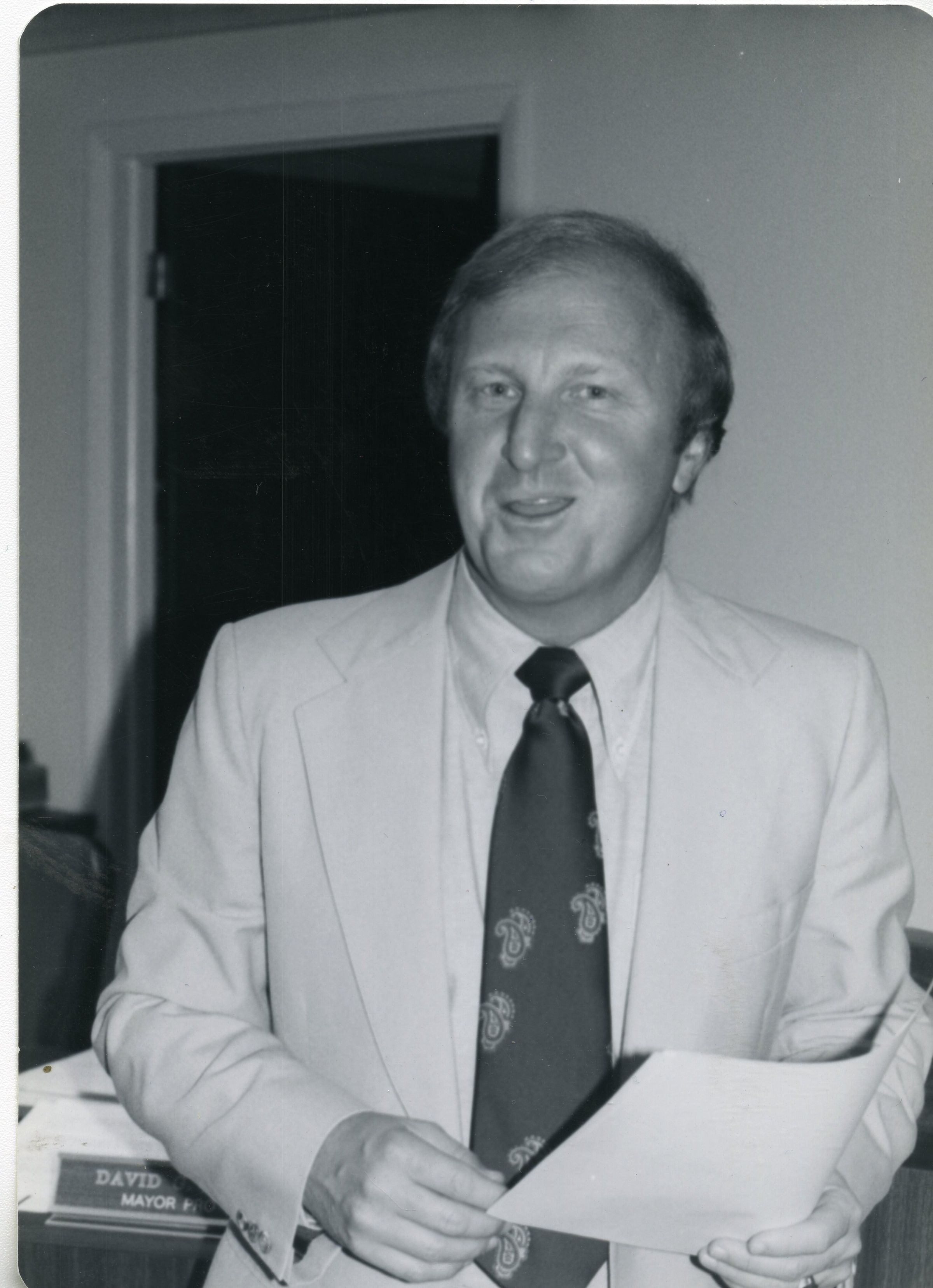 Paul Derda holding a paper standing in front of a desk likely belonging to David Jackson, Mayor Pro-Tem at the time.