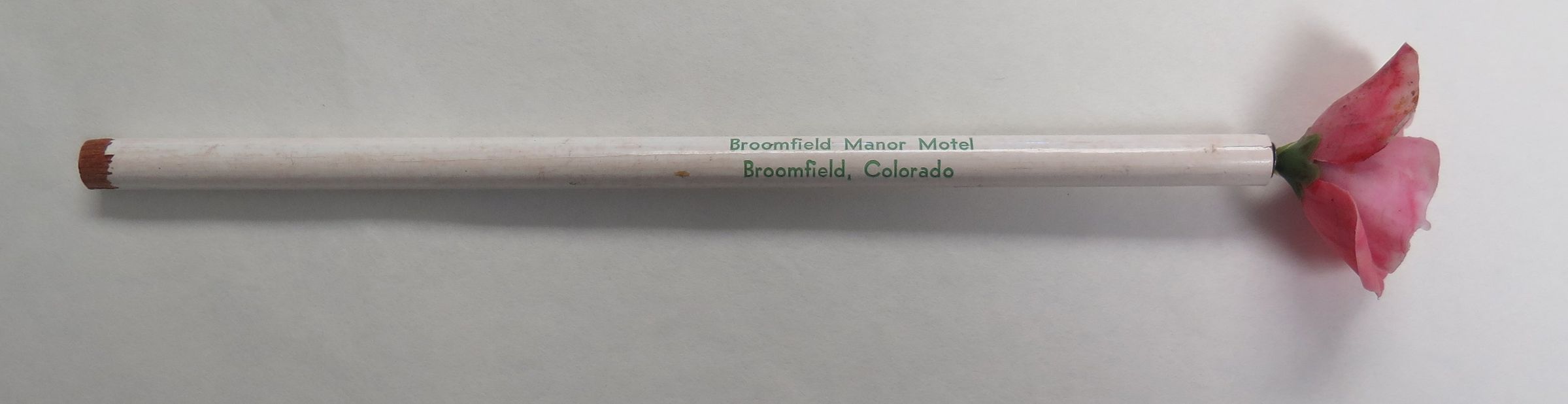This is a white pencil with an attached pink fabric flower 8"(L) . On the pencil is text that reads: "Broomfield Manor Motel Broomfield, Colo."