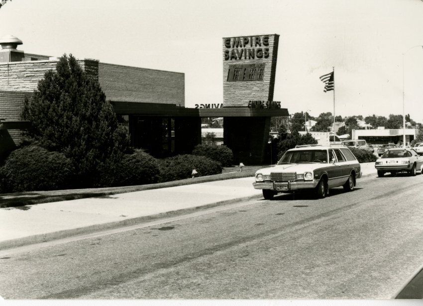 1 Garden Center, photo taken from Midway Blvd. with the sign out front reading "Empire Savings" which is not what it reads today, the clock on the sign reads 3:58. A flag waves out front. 4 Garden Center can be seen in the background easily.Lexicon