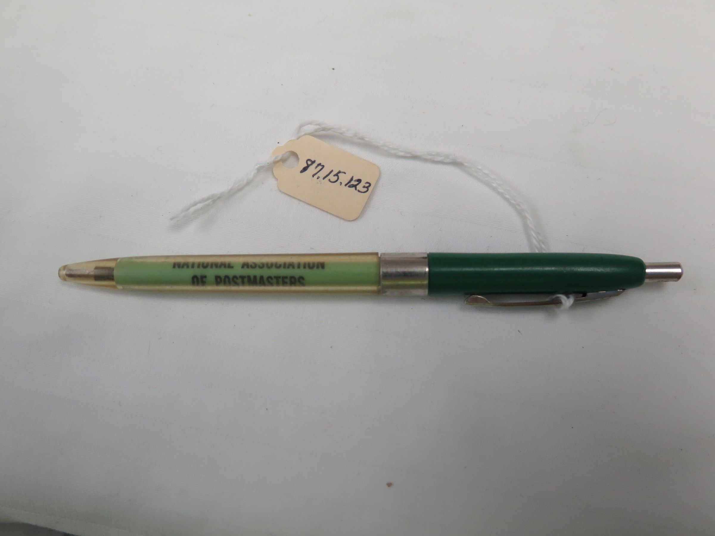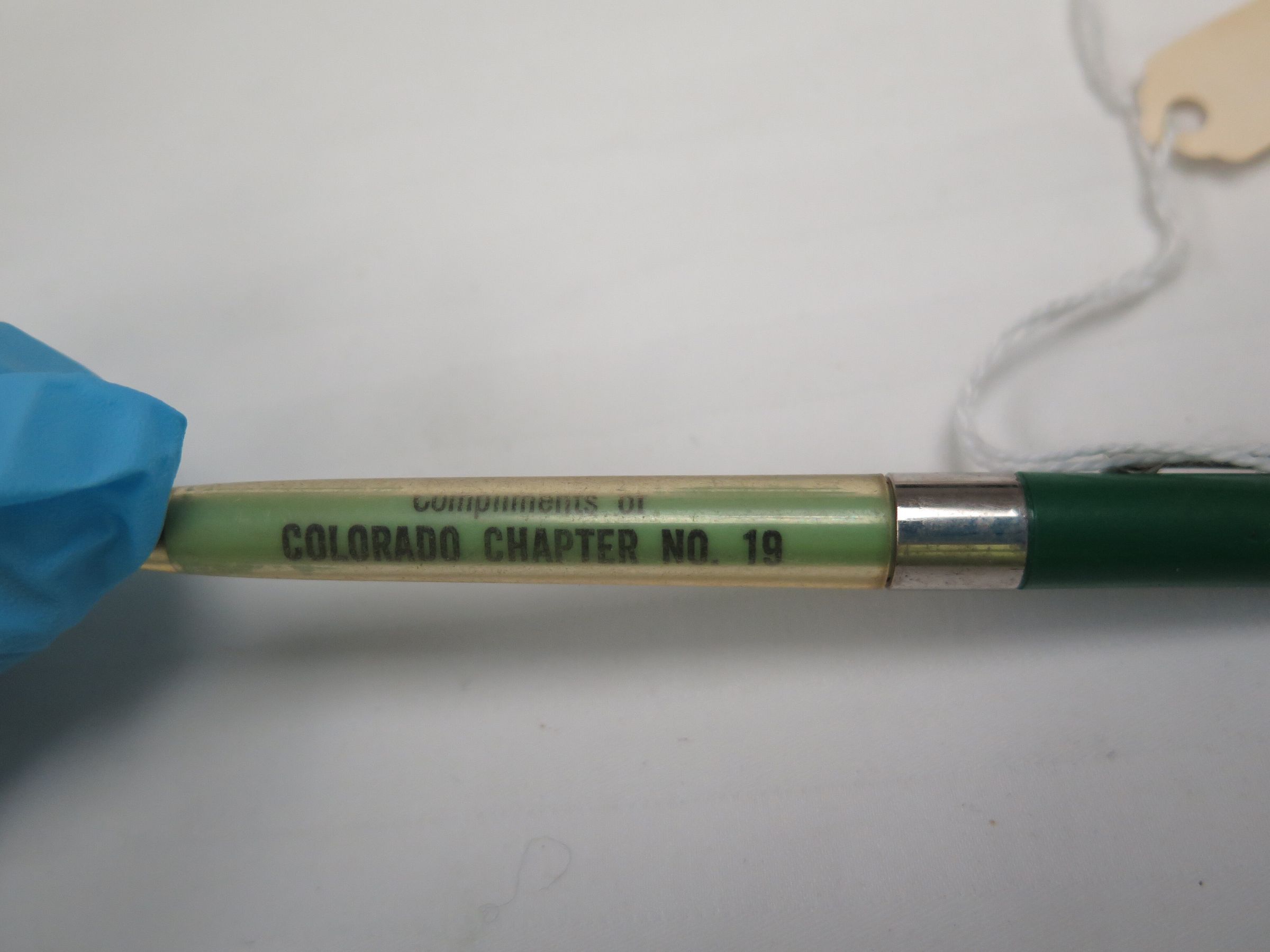 This is a green ballpoint pen with the words,"Compliments on Colorado Chapter No. 19" on one side and, " National Association of Postmasters" on the other. The pen measures 0.25" (w) x 5" (l).Collection
