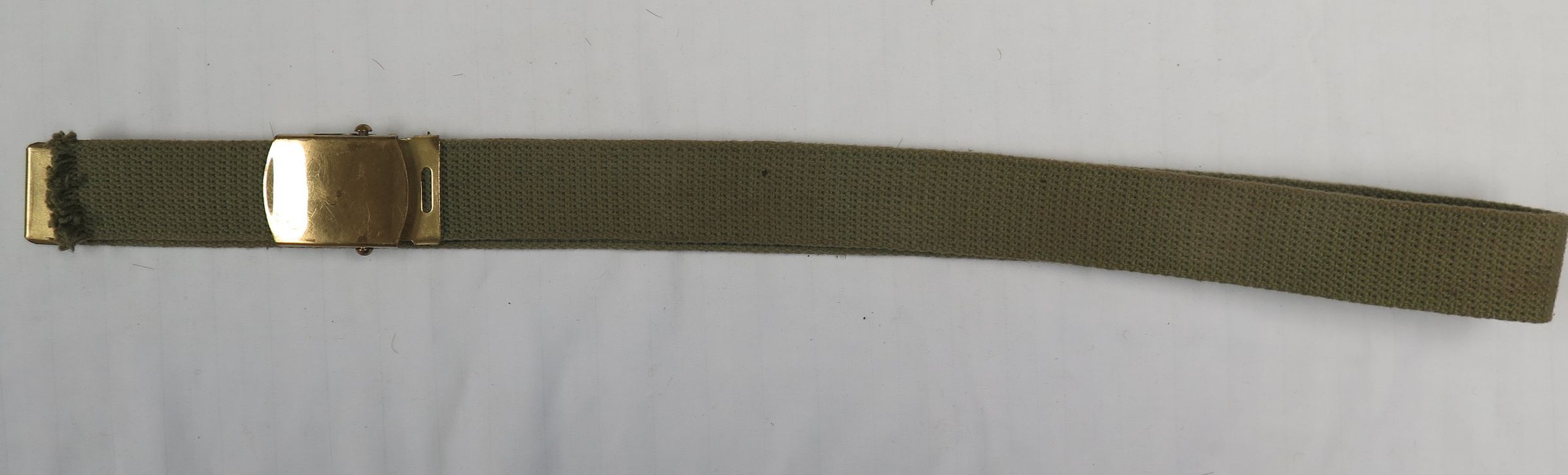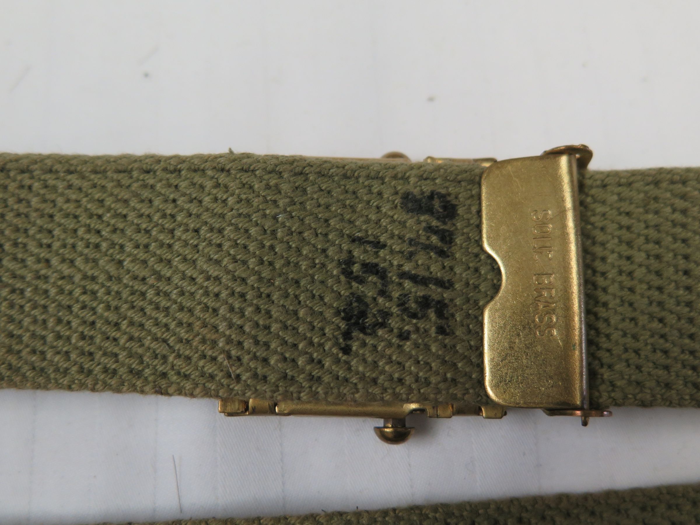 Military belt with brass buckle and olive coloring. Buckle reads "Solid Brass." Belt measures 15" (w) x 38" (l).