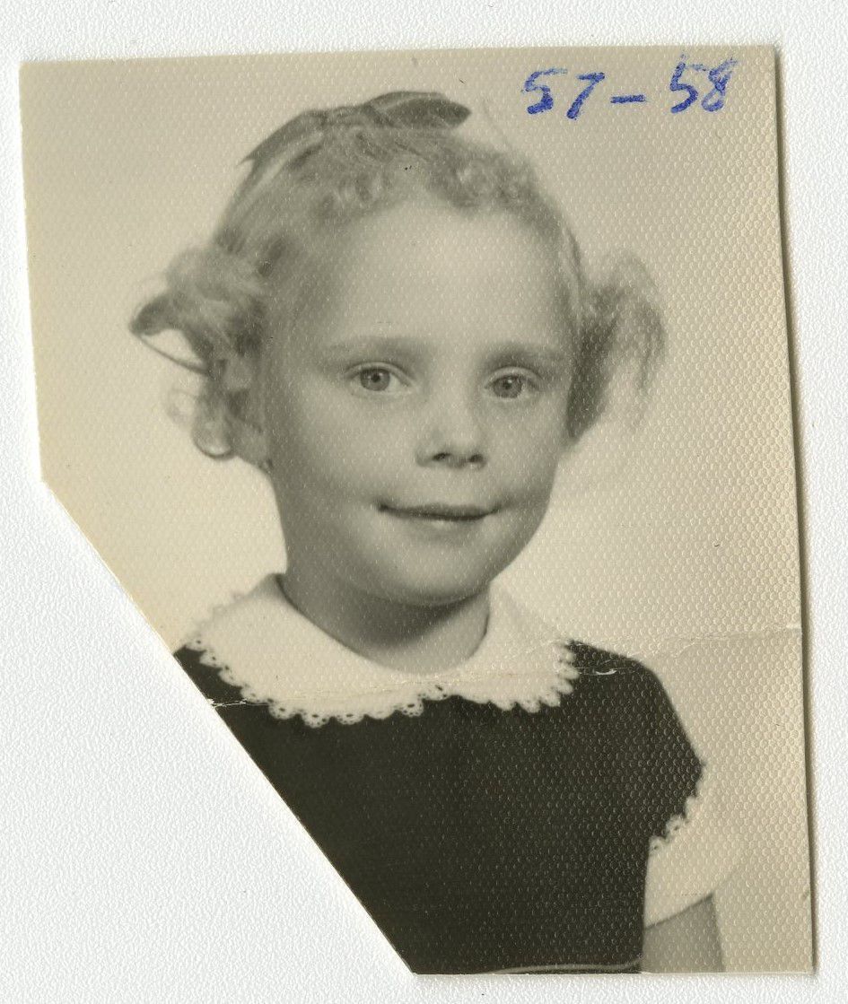 Black and white photograph of a girl in the Brunner family. Handwritten on the photograph is 57-58