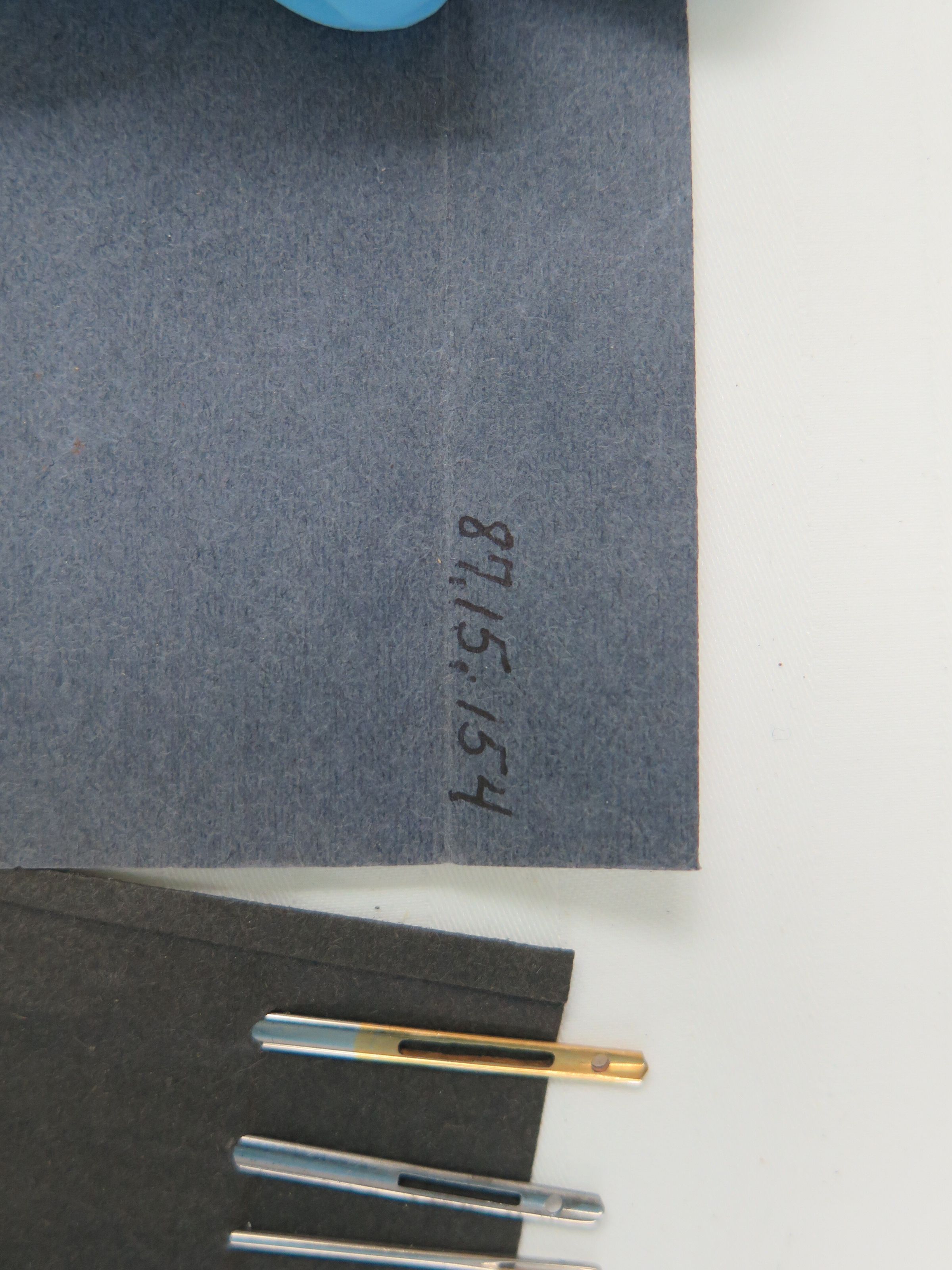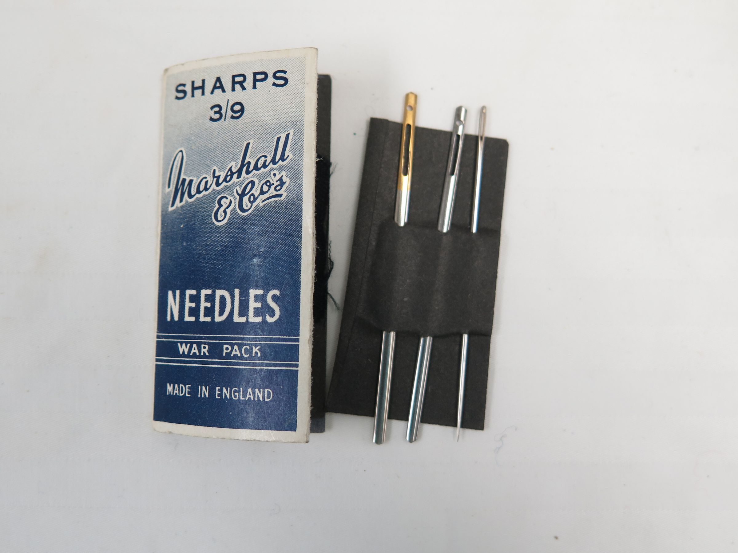This is a packet of needles with ribbon threaders. The packet is blue and white with the text, "Marshall & Co's/ Rust Resisting/ Sheffield Steel/ Needles" on the front.