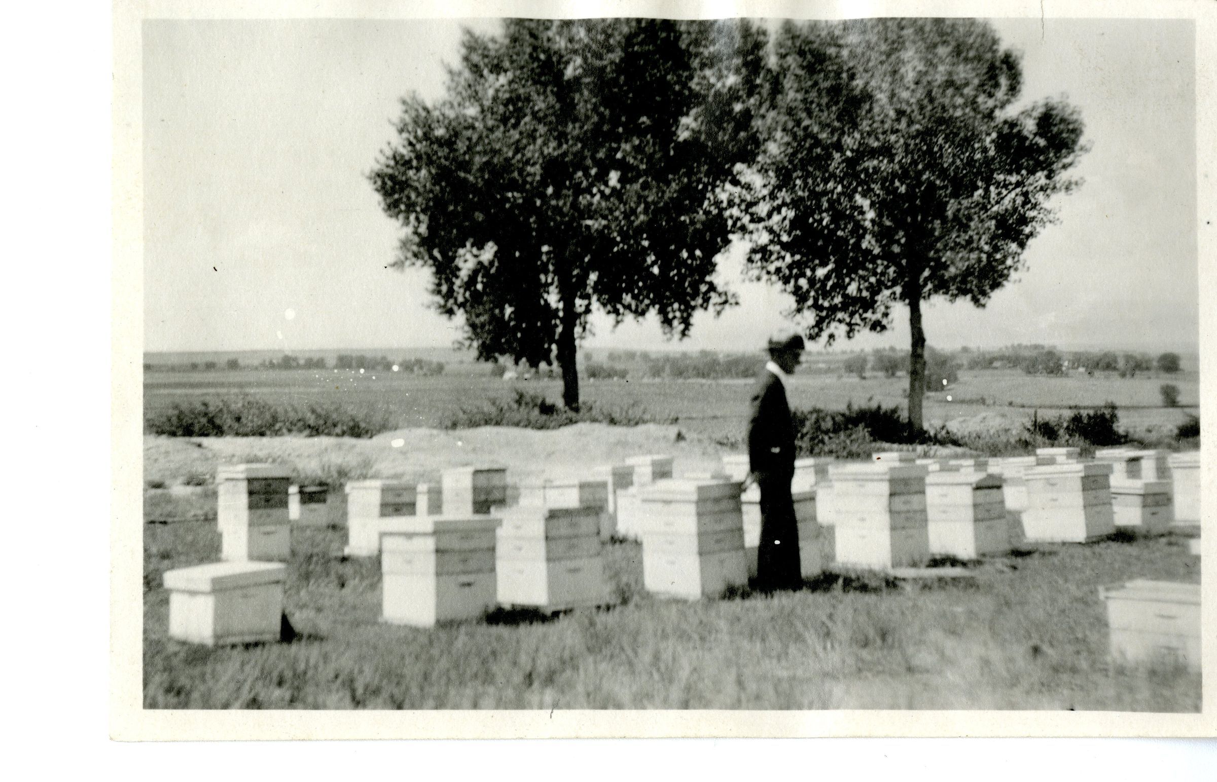 Crawford Honey Bee Boxes. B&W photograph of an unidentified man standing with bee boxes. Possibly behind the Crawford farm looking SW. Original