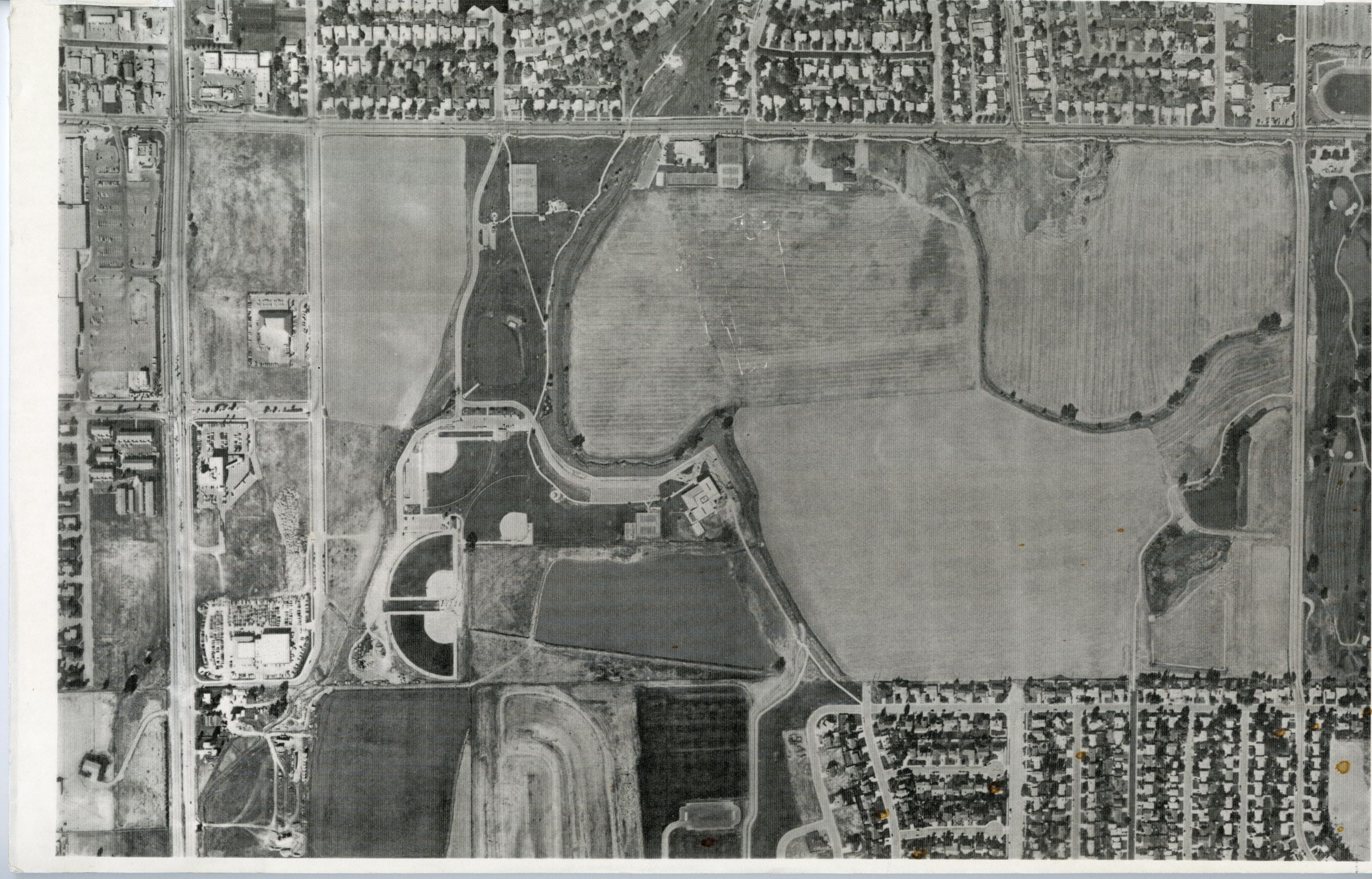 Item is a black-and-white aerial photo of Broomfield mounted to a white foam board. In the picture, the Brunner reservoir is visible amongst a few neighbors and mostly undeveloped land. The baseball diamonds can be seen near the plot of the land where the Mamie Doud Eisenhower Library will eventually be built. The image centers on some of the fields behind the Reservoir.
