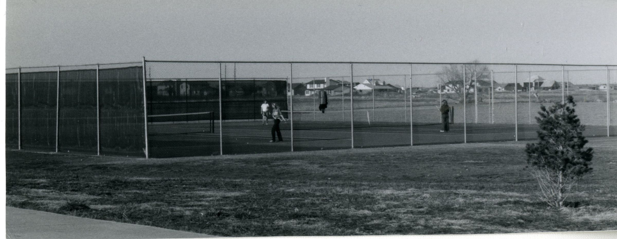People at tennis courts. Small tree in foreground.