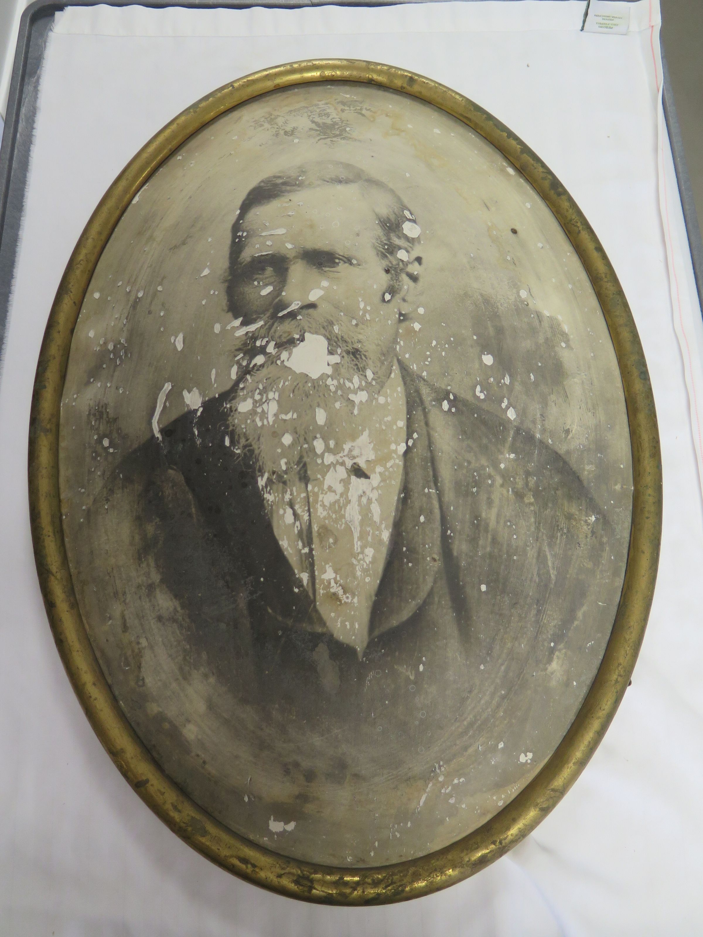 This is a framed oval portrait of King Crawford (grandfather of Miles). The portrait is in black and white and has been damaged, obscuring part of the face. The frame is gold colored. The frame measures 20" (h) x 14" (w).