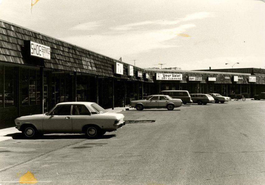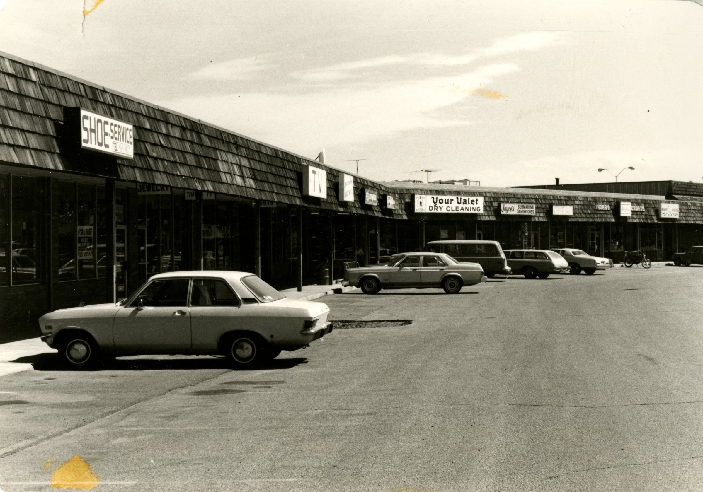 This is a Black and White photo from the parking lot of an old strip mall. Companies that are featured in the photo are (Right to left) ASA crafts, Hobby. Barber Shop, Joyce's Submarine Sandwiches, Your Valet Dry Cleaning, (unreadable sign), (unreadable sign), (unreadable sign), TV, and Shoe Service.Collection