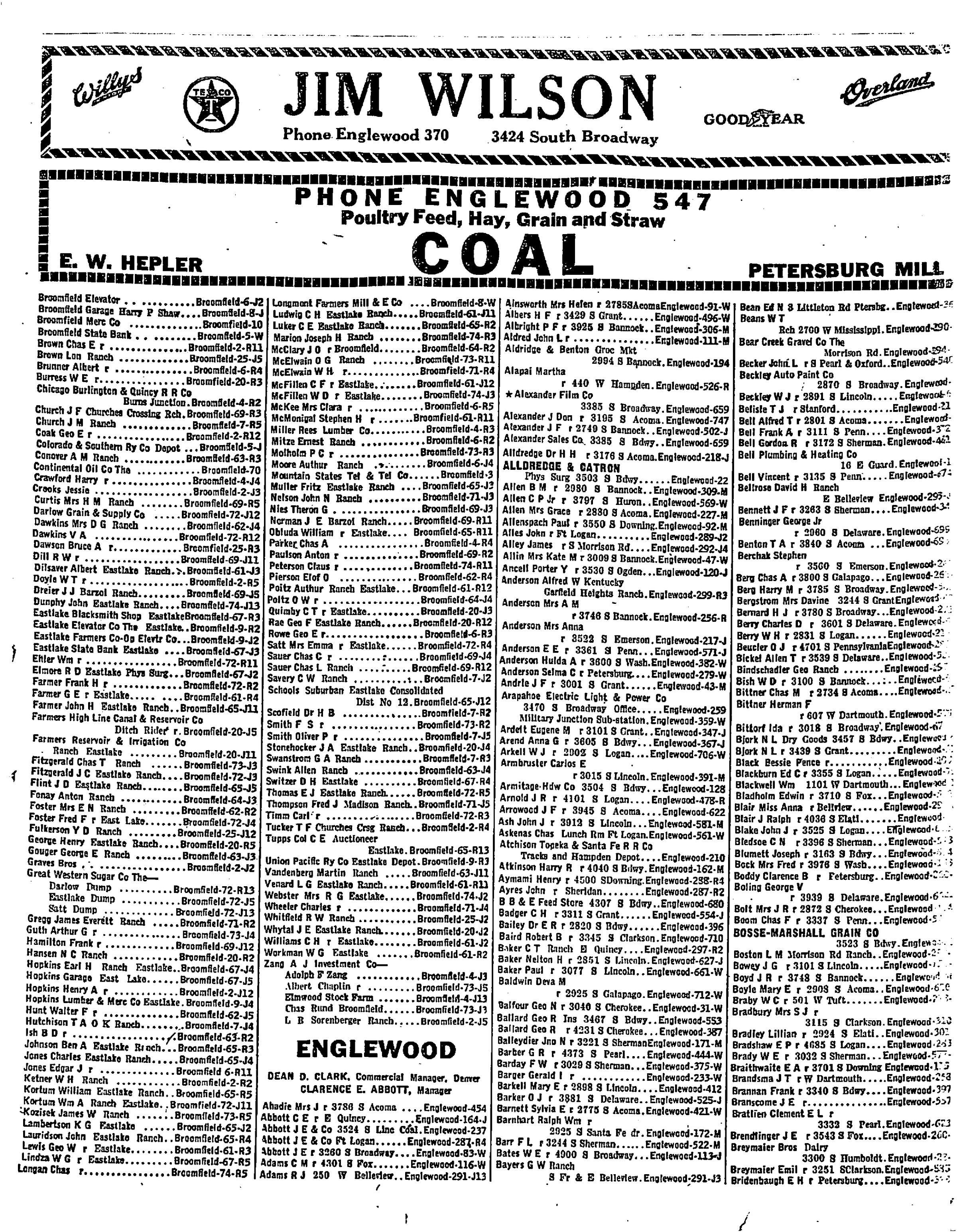 This is a photocopy of the 1924 telephone directory. At the top it says "Jim Wilson Phone Englewood 370 3424 South Broadway". There is also advertisements on either side for Willy's Knight, Teva co, Good Year, and Overland. There two pages of the telephone directory cover from Englewood all the way to Broomfield East Lake. At the bottom of page two is an advertisement for the Broomfield Garage that was ran by Harry P. Shaw.