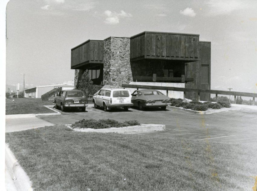 This is a black and white photo of the old bank at 119th and Main. There are three cars in the parking lot and seven spaces.Collection