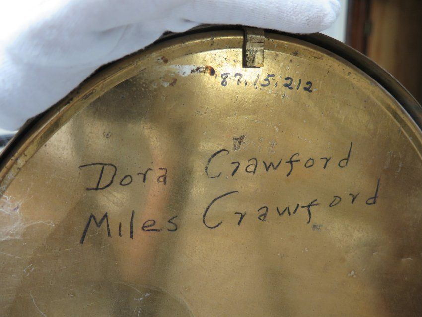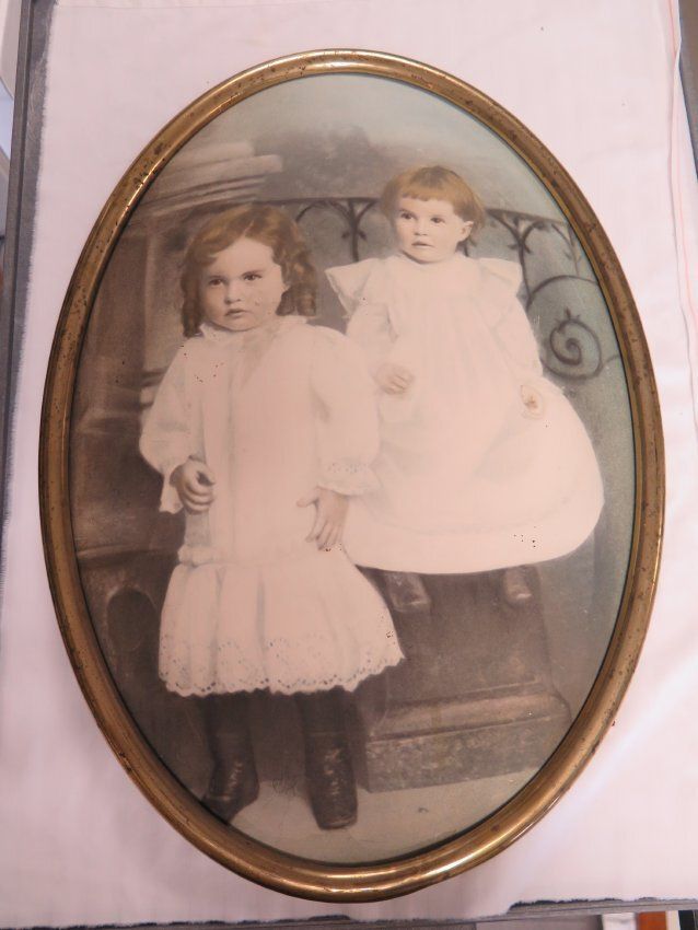 This is a framed oval portrait of "Dora Crawford and Miles Crawford" as children. They are both wearing white. The portrait was in black and white, and has been colored. The frame is gold colored. The frame measures 20" (h) x 14" (w).