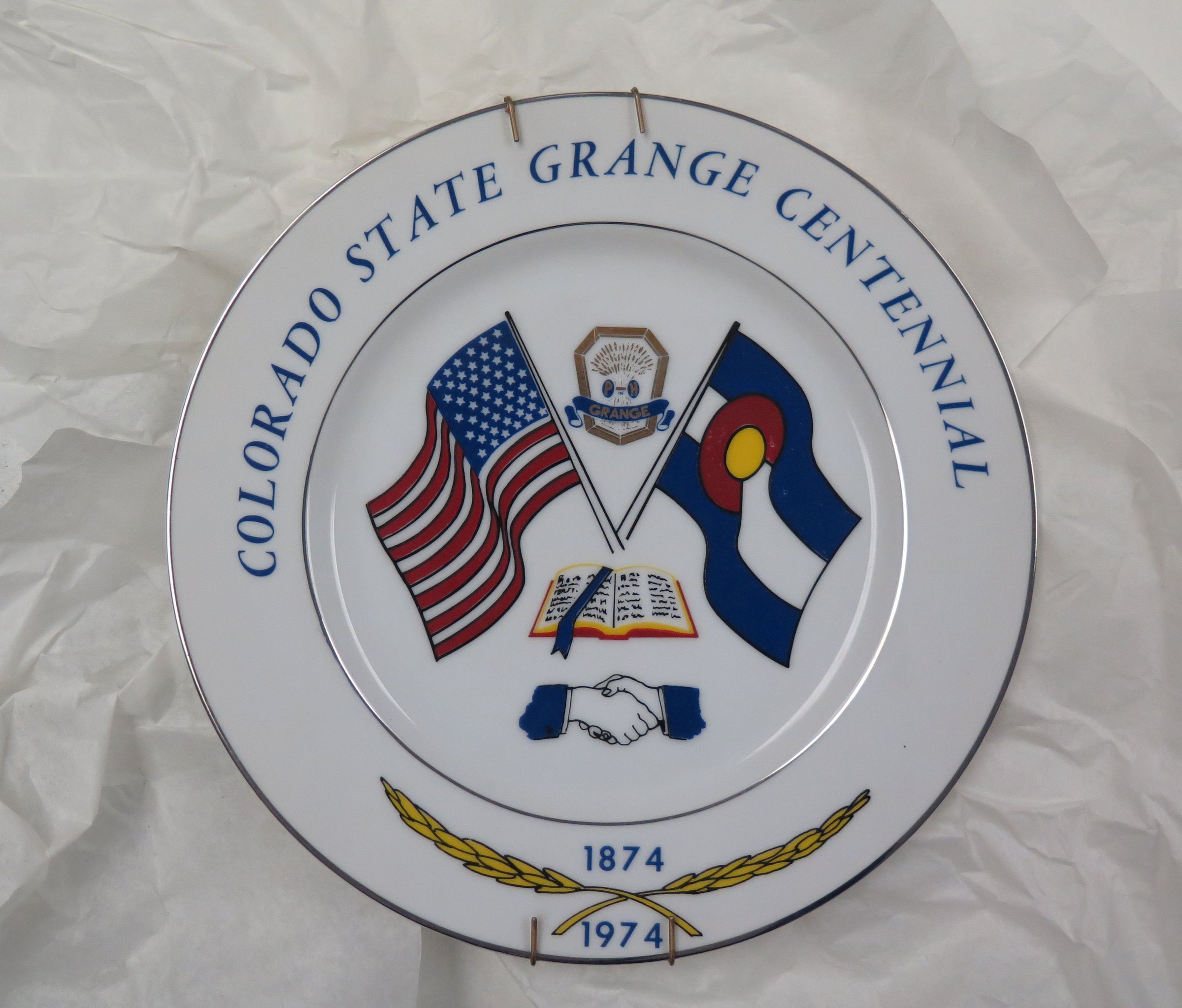This is a white commemorative plate for the Colorado State Grange Centennial. The plate has a silver colored rim and an image in the center. The image shows a US flag and a Colorado flag with two hands shaking beneath it. The text around the edge of the plate reads,"Colorado State Grange Centennial" around the top and "1874-1974" around the bottom. The plate measures 10.25" (dia).Collection