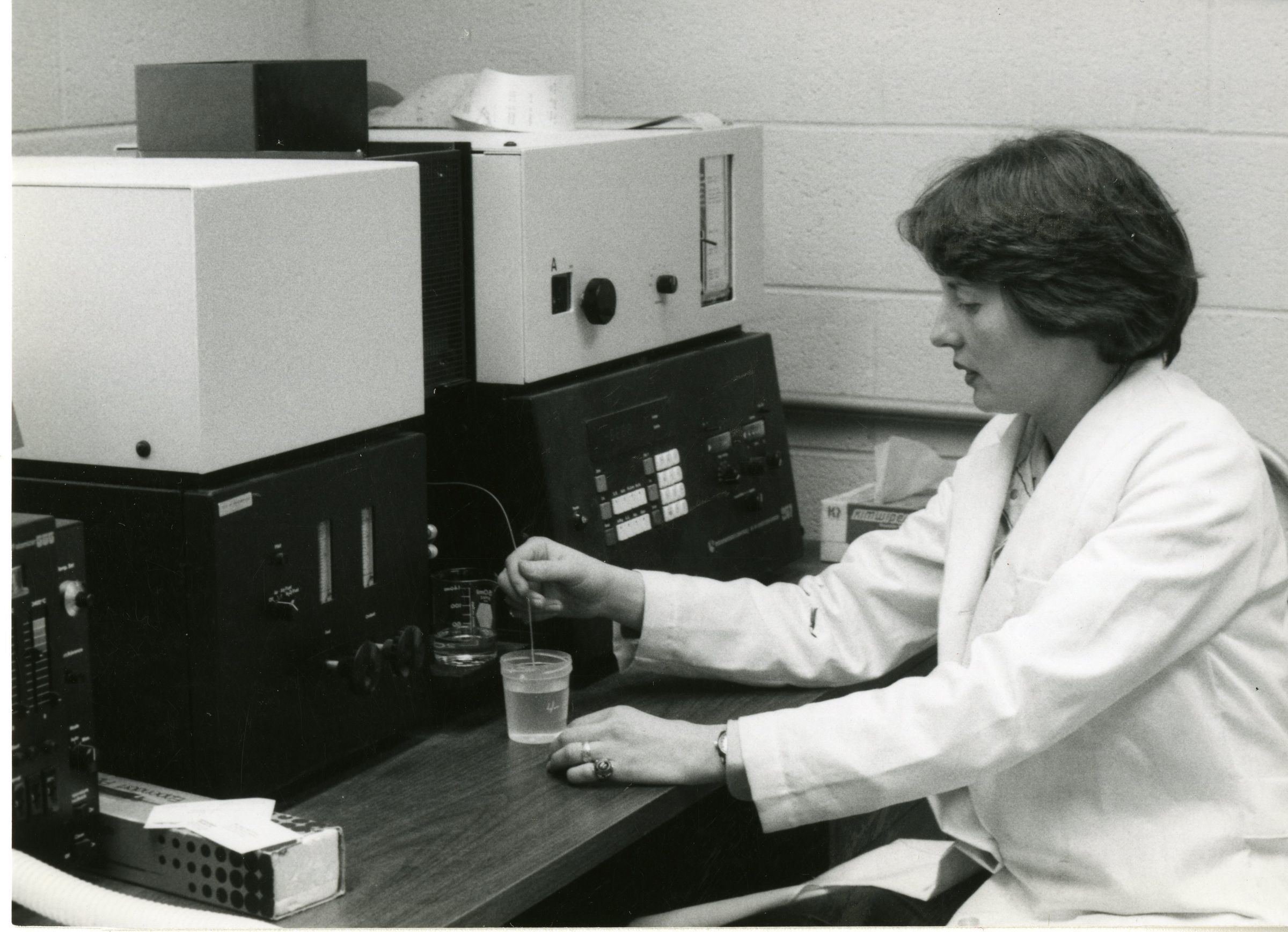 This is a black and white photo of a lady working on what is believed to be a cup of water at the Water treatment plant. She has her hair cut short, she is wearing a lab coat and her wedding ring.Collection
