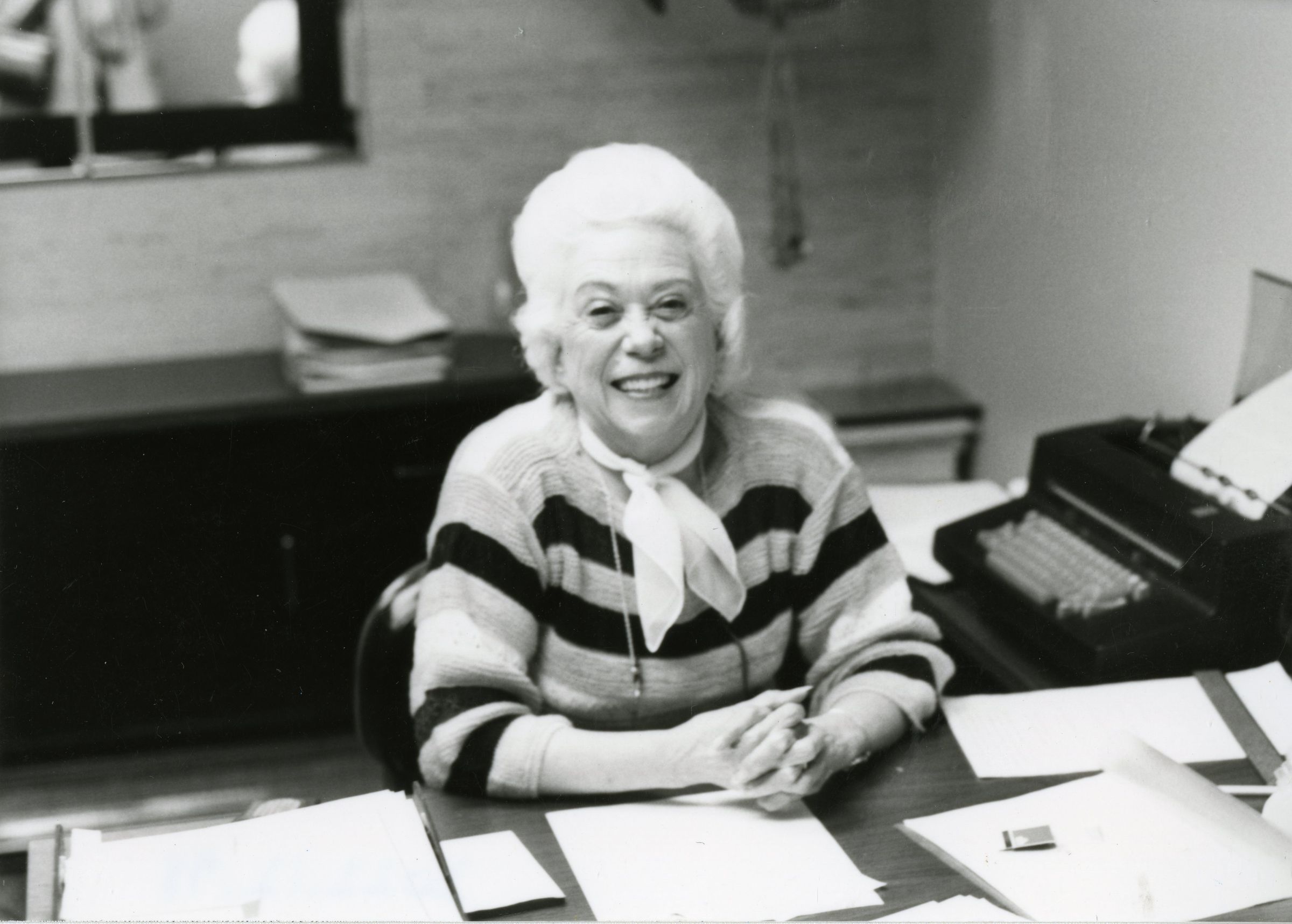 This is a black and white photo of a lady at a desk smiling. She is wearing a sweater with large stripes, a small scarf tied around her neck and her glasses hanging by a chain around her neck. on the right side of the photo is an old typewriter, in front of the lady on the desk are various piles of paper and behind her is a large stack of papers. Subject is possibly Ramona Gossenaur?Collection