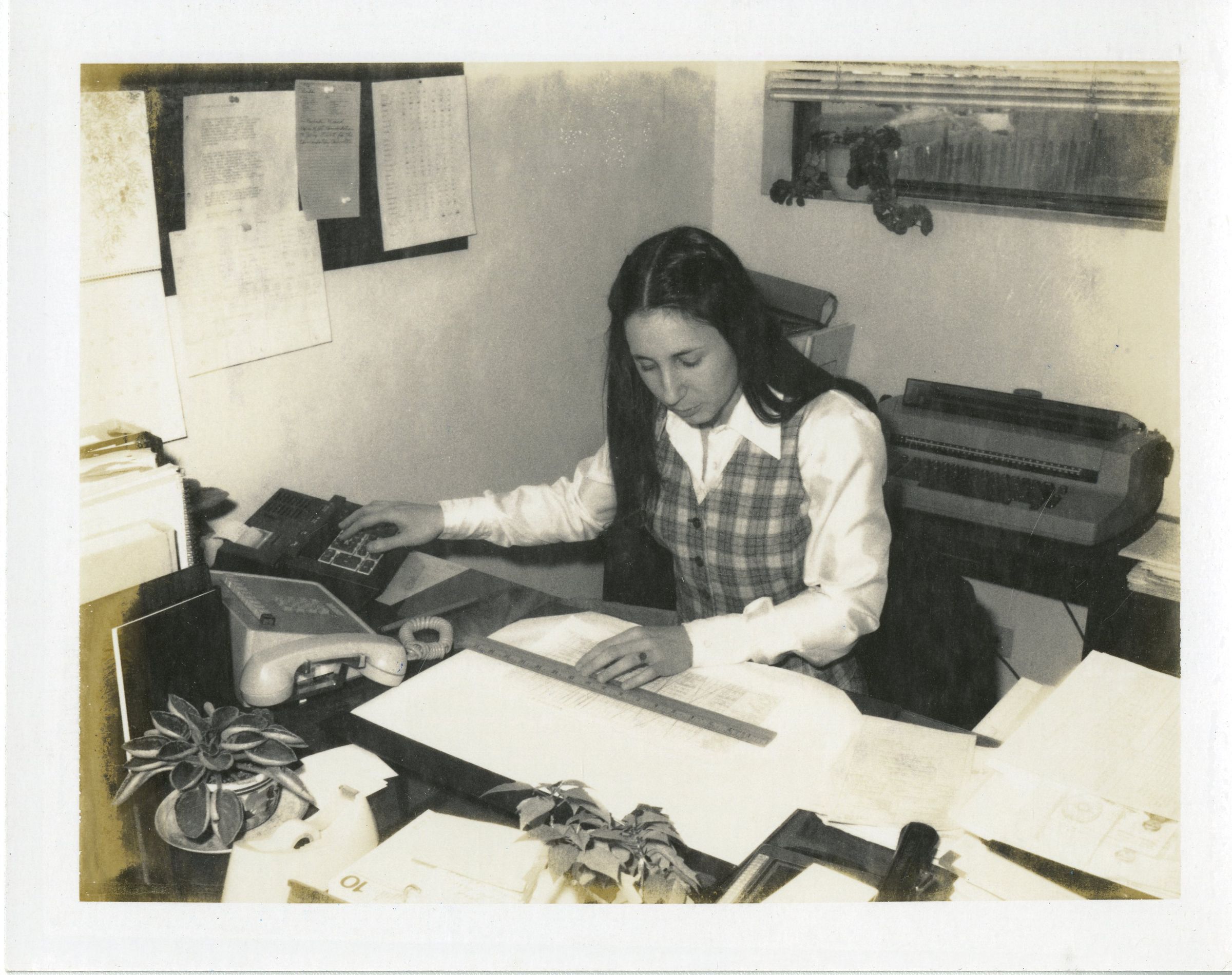 Linda Dorsey working at desk, likely at 6 Garden Center