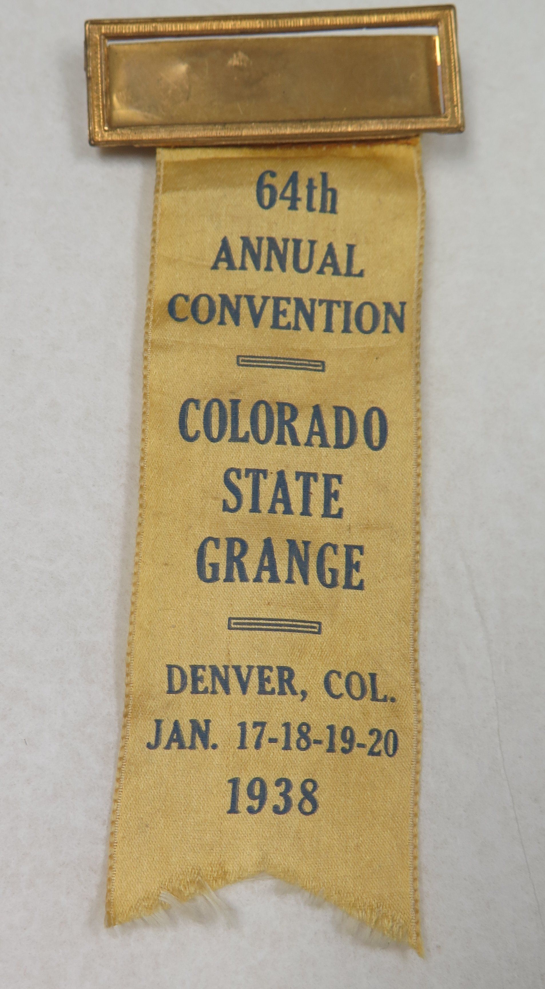 This is a small yellow ribbon attached to a metal name tag with light blue text. The metal tag is brass colored and would hold a paper insert with a name written on it, this is missing. The ribbon reads, "64th Annual Convention, Colorado State Grange, Denver Col, Jan. 17-18-19-20, 1938". The ribbon measures 5" (h) x 1.5" (w).