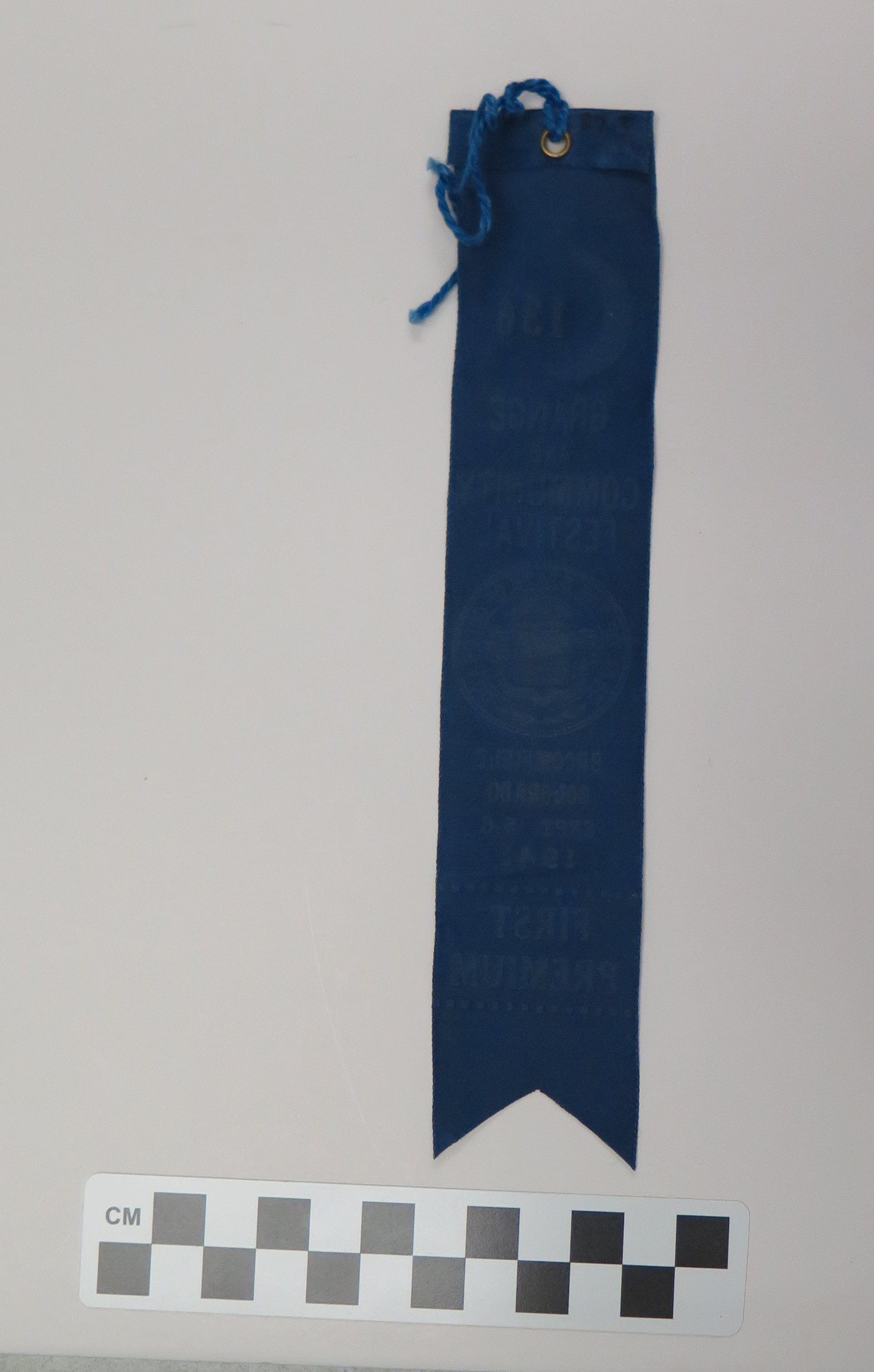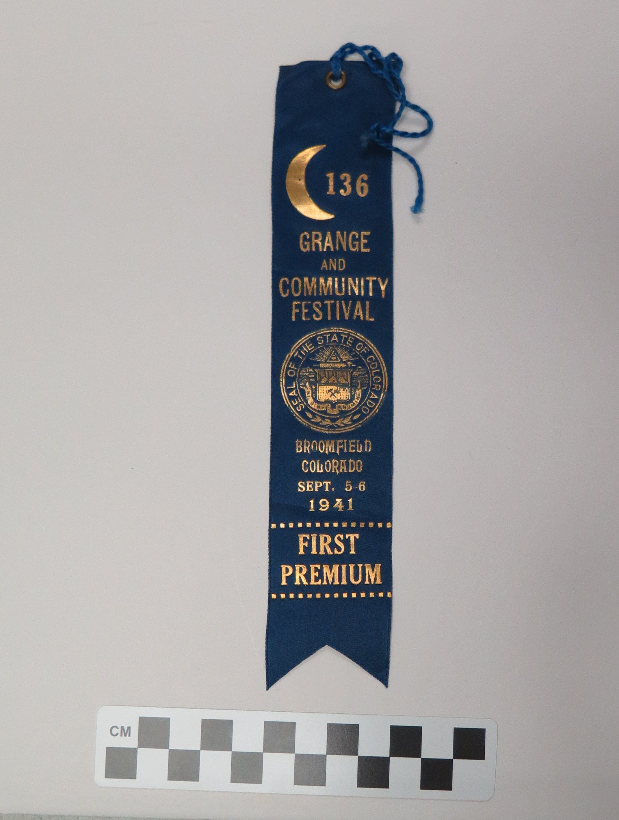 This is a blue prize ribbon from the Grange and Community Festival. The ribbon has a rivet at the top with a blue string through it. The ribbon has gold text that reads, "136/ Grange/ and/ Community/ Festival/ Broomfield/ Colorado/ Sept. 5-6/ 1941/ First/ Premium". The ribbon also has the seal of the state of Colorado and the Crescent Grange logo on it.The ribbon measures 1.5" (w) x 8" (l).